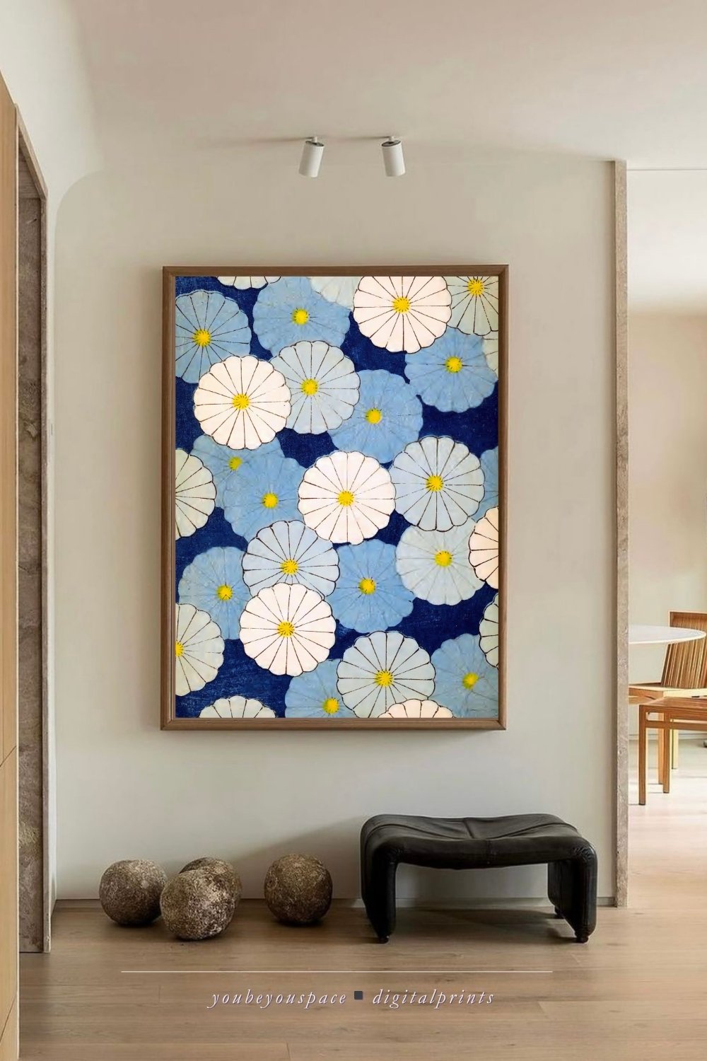 “Flower-Umbrellas-Blue” comes from the Shin-Bijutsukai design magazines of the late 1800s–early 1900s, a treasured resource for artists and textile makers. Carefully restored, this artwork blends floral motifs with iconic umbrella patterns, creating a soft and timeless composition perfect for contemporary interiors.