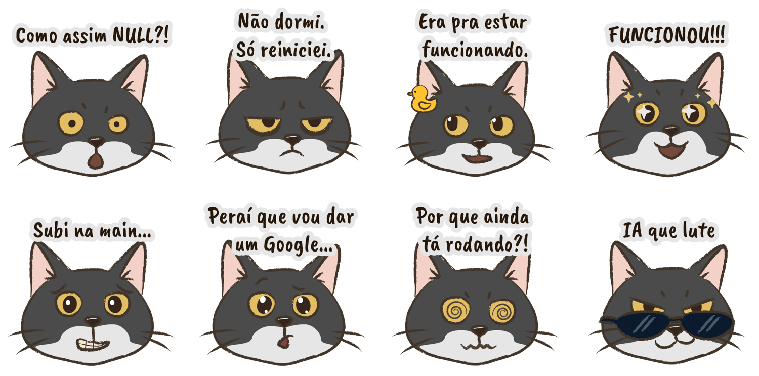 Este pack traz 8 figurinhas em estilo emoji retratando o caos do dia a dia dev: do bug inexplicável ao "FUNCIONOU!!!", passando pelo clássico “subi na main sem querer”.