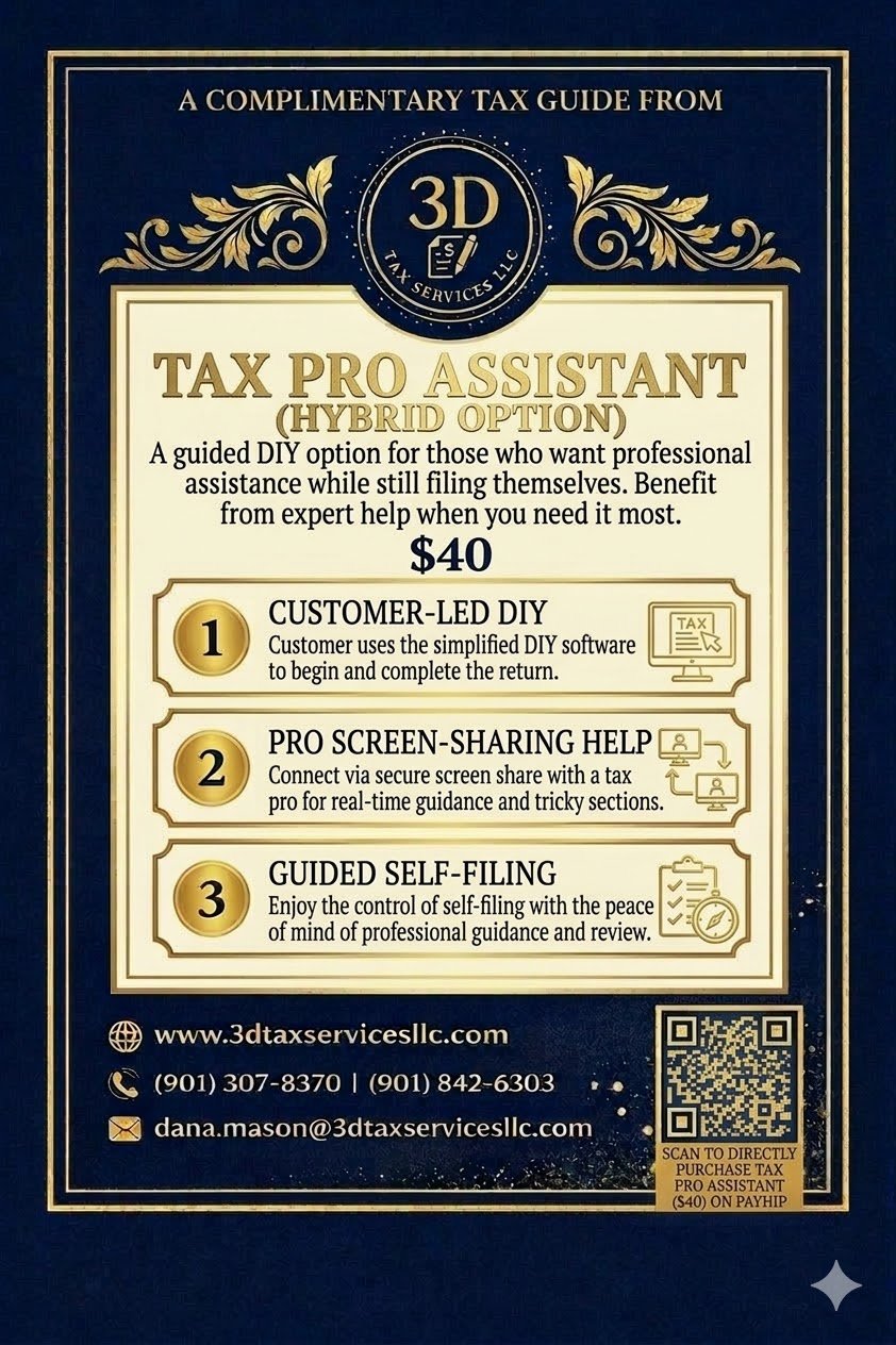 Do you prefer to handle your own taxes but wish you had an expert sitting right next to you for those "just in case" moments? Introducing the Tax Pro Assistant from 3D Tax Services LLC. For just $40, our Hybrid Option gives you the independence of DIY filing with the ultimate peace of mind that comes from professional oversight.