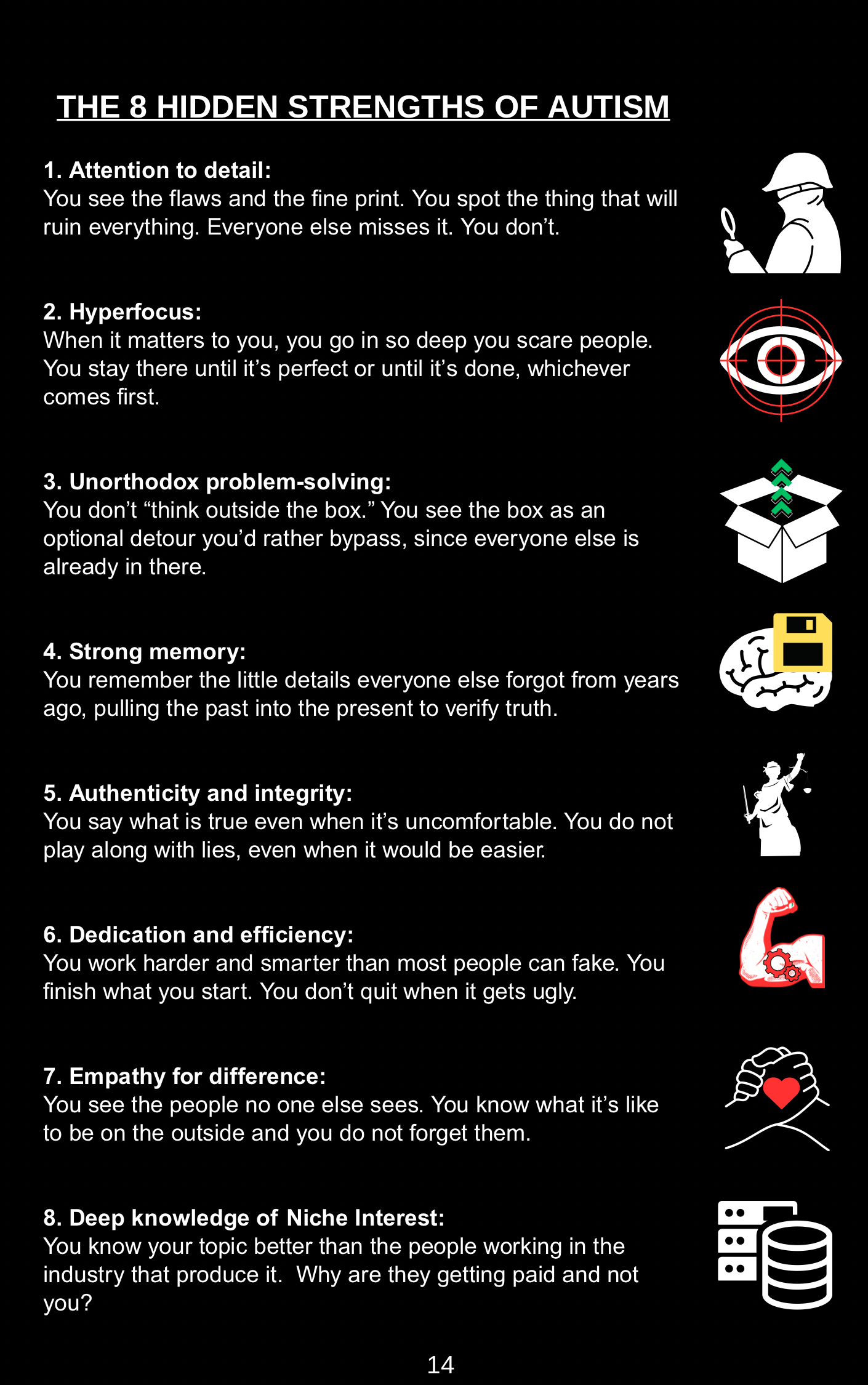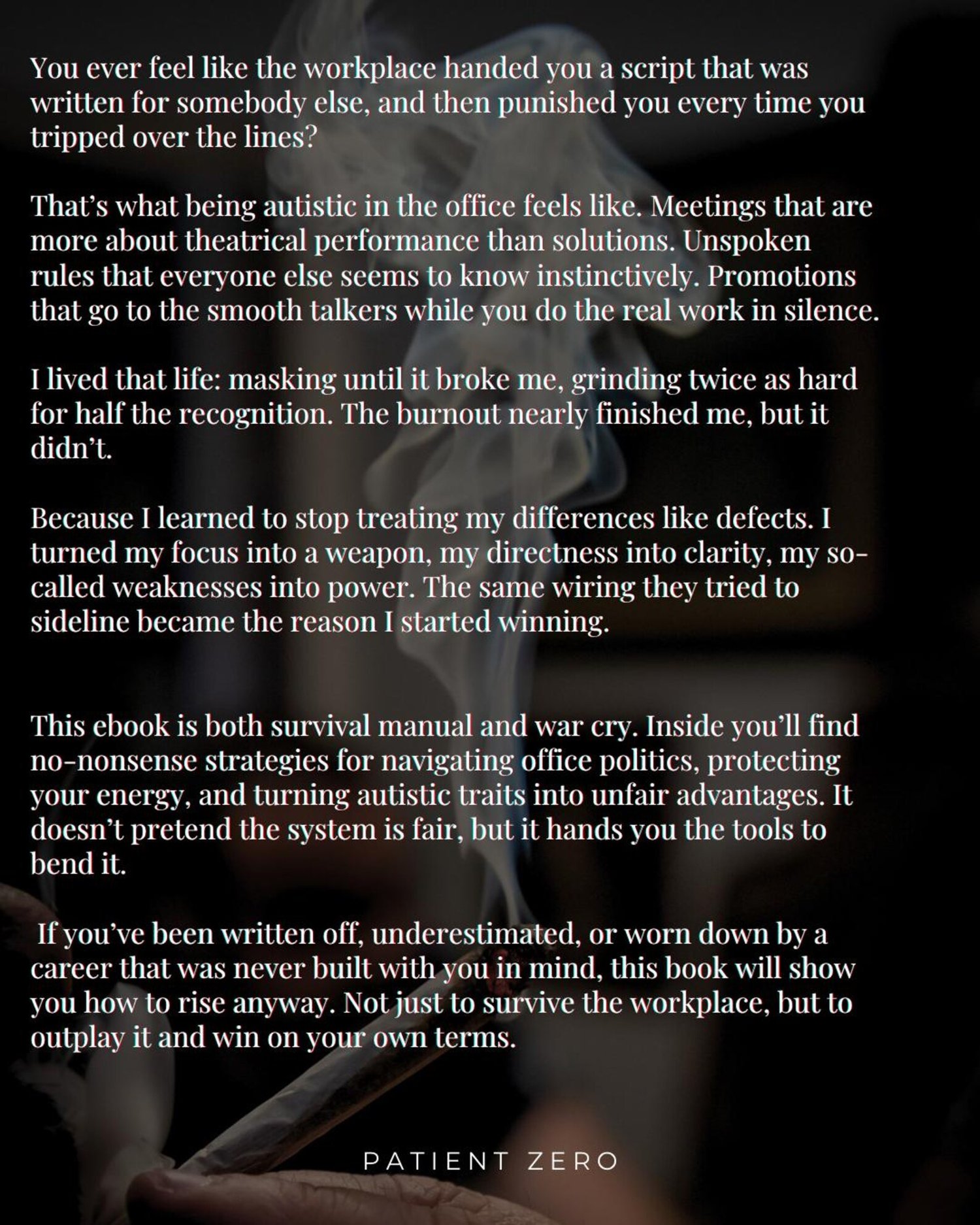 It blends real-world career tactics with hard first-hand truths about being Autistic in a neurotypical system. You’ll learn to stop fighting yourself, start bending environments to your needs, and channel autistic intensity into results that pay. Everything I've added to this is something I've already done in the corporate environment many times.