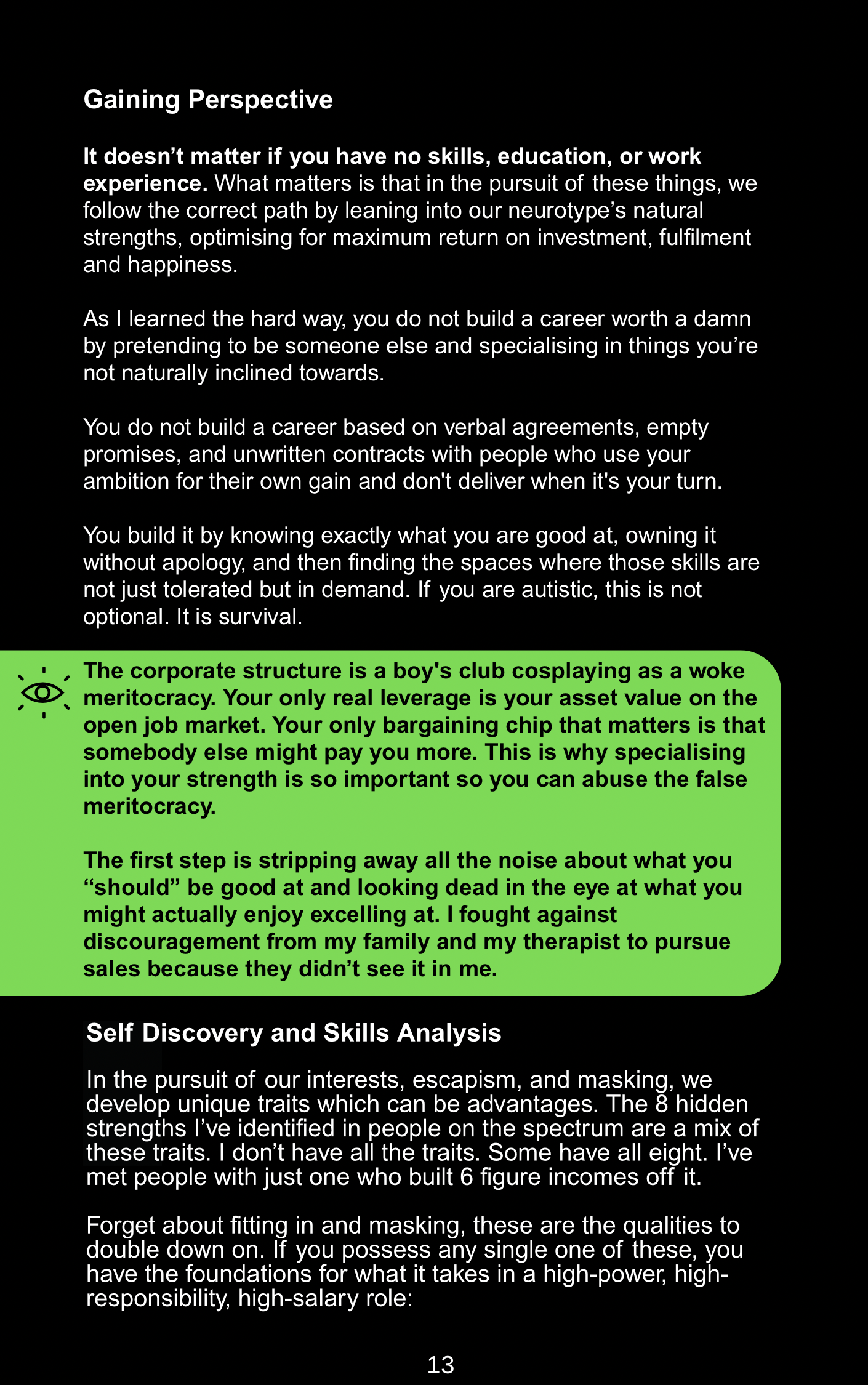 This was written from the inside so it's raw, unfiltered, and brutally honest. I don't pretend anything is fair, it was forged in autistic lived experience and written from a place of sheer frustration with the uselessness of the career guides, corporate training, other autism resources and patronizing feel-good self-help books available.