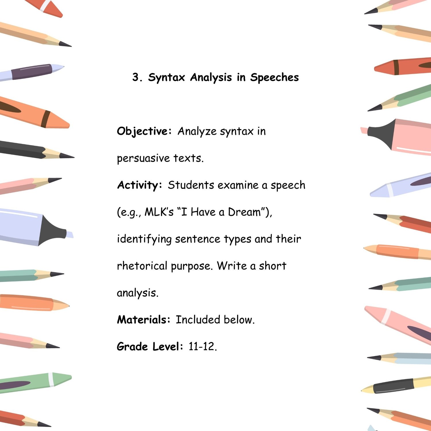 These 8 activities are designed to teach syntax skills to high school students (grades 9-12) in an engaging, rigorous, and analytical way. They focus on advanced sentence structure, clause usage, punctuation, and rhetorical effects to enhance writing and critical thinking. Each activity includes clear instructions, minimal materials, and a suggested grade level. Worksheets and excerpts are included.