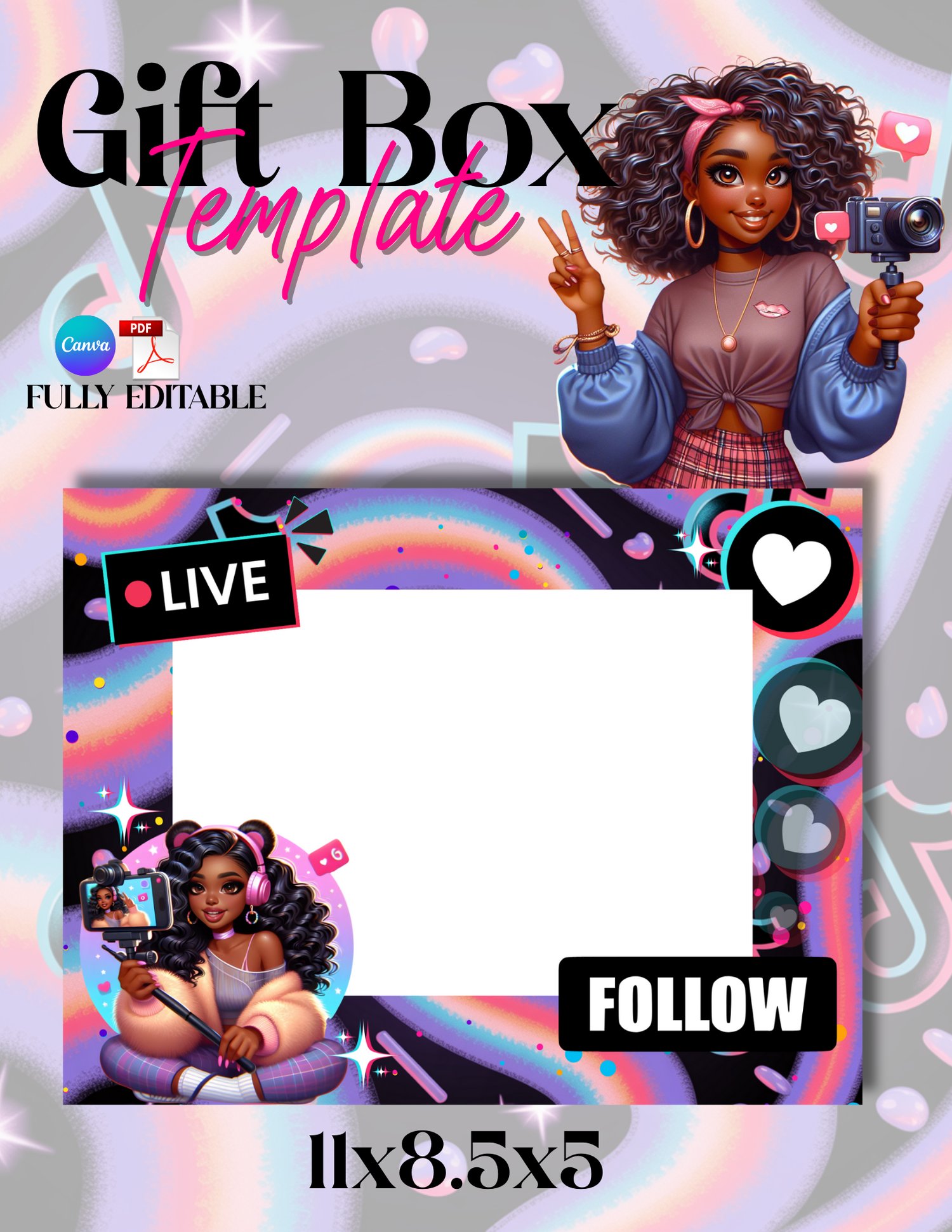 Bring your brand to life with this bold and colorful Gift Box Template! Perfect for influencers, streamers, and content creators, this design is fully editable in Canva or PDF so you can customize it to fit your style. Featuring fun glossy graphics, rainbow accents, and social media-inspired icons, this box makes a statement for any event, launch, or promotion.