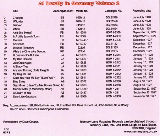 We present another rare collection of Al Bowlly's recordings made in Germany in 1927 and 1928 before he arrived in England. Twenty two sides with the bands of Billy Bartholomew, Fred Bird, Rene Dumont, John Abriani and some under his own name.