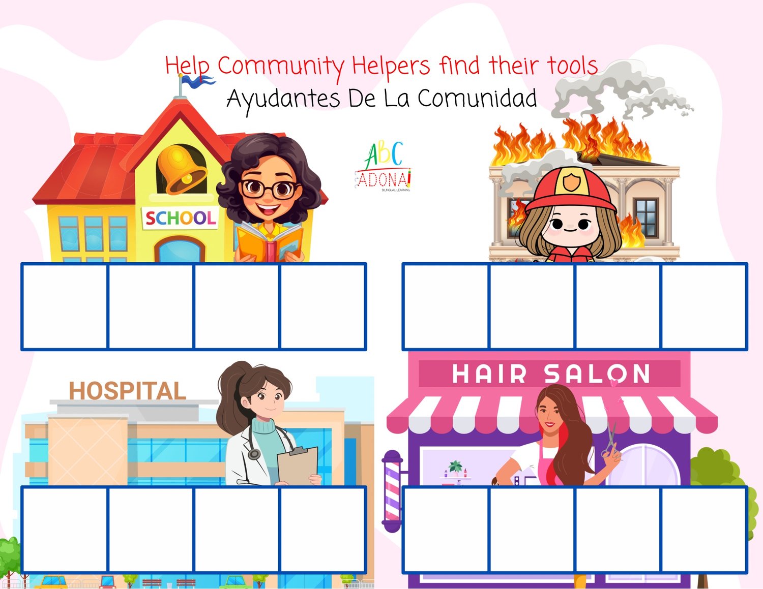 - Ayudantes de la comunidad (maestra,doctora, beautician, bombera) (parea sus instrumentos con su profesion)