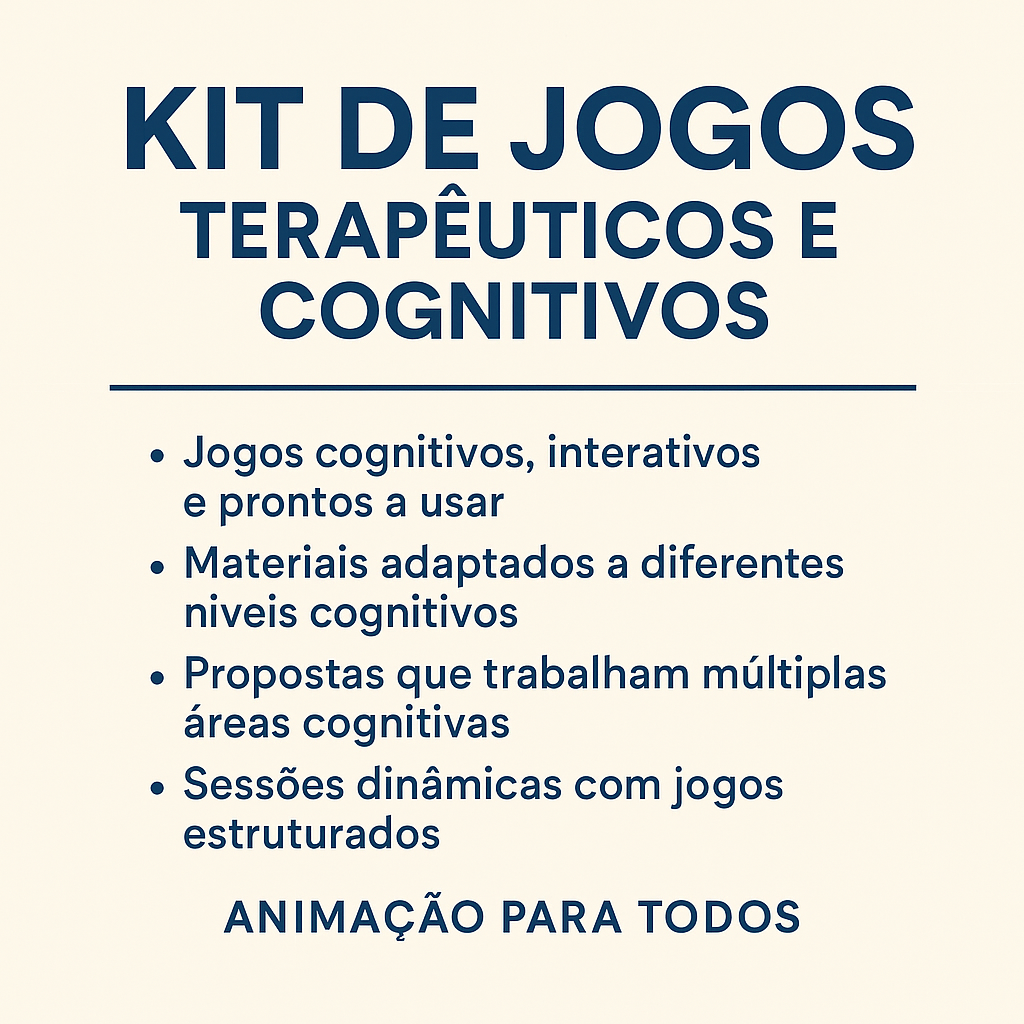 Este kit reúne todos os jogos cognitivos, funcionais e terapêuticos produzidos em 2025 para dinamizar sessões de animação sociocultural com idosos. O conjunto inclui jogos em PDF e PowerPoint, atividades temáticas, materiais de estimulação cognitiva e exercícios funcionais preparados para trabalhar memória, atenção, perceção visual, raciocínio, linguagem, cálculo e competências do dia a dia.