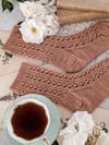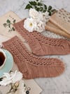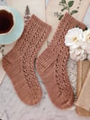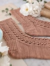 The lace columns on these socks feel very higgledy-piggledy to me in a satisfying sort of way, much like old houses that are leaning a bit to the side. Although they’re technically knit from just one yarn, all the different stitch textures in these socks make them look like they’ve been assembled from a curious hodgepodge of bits and bobs.