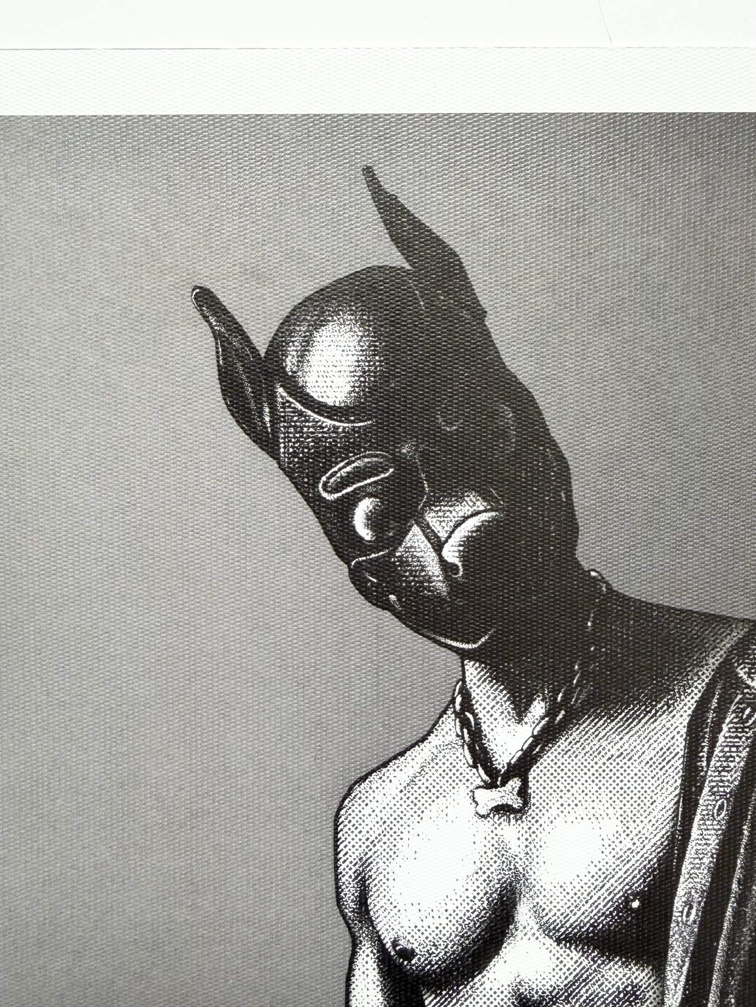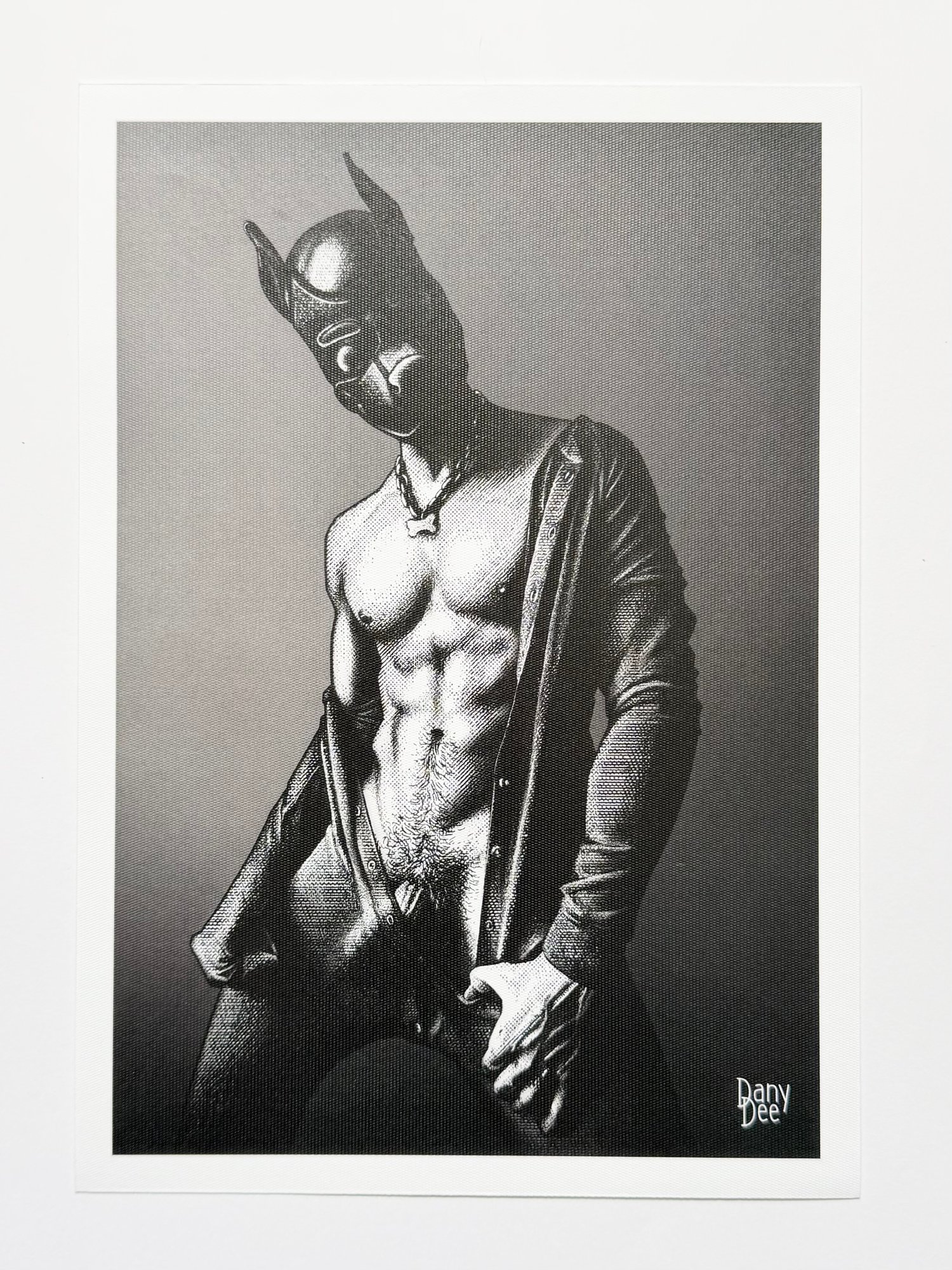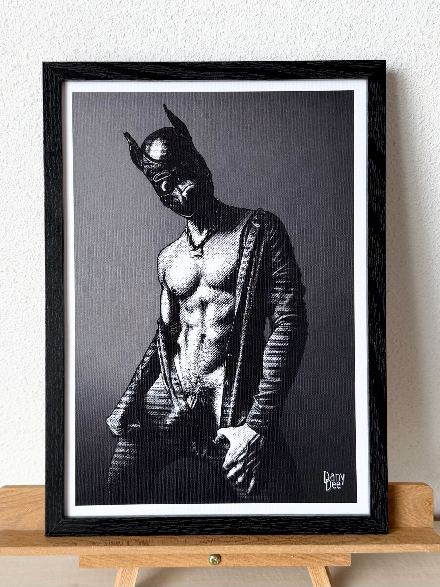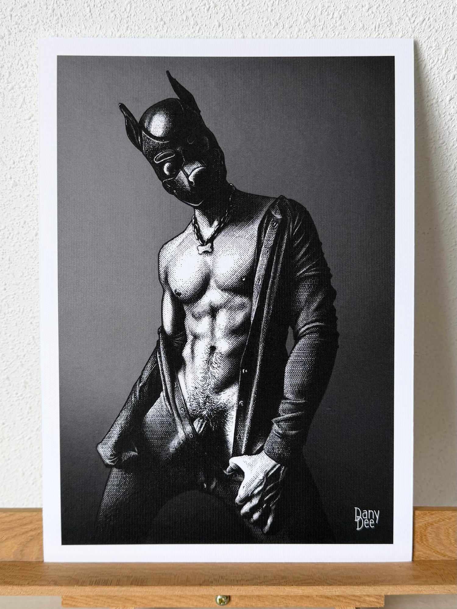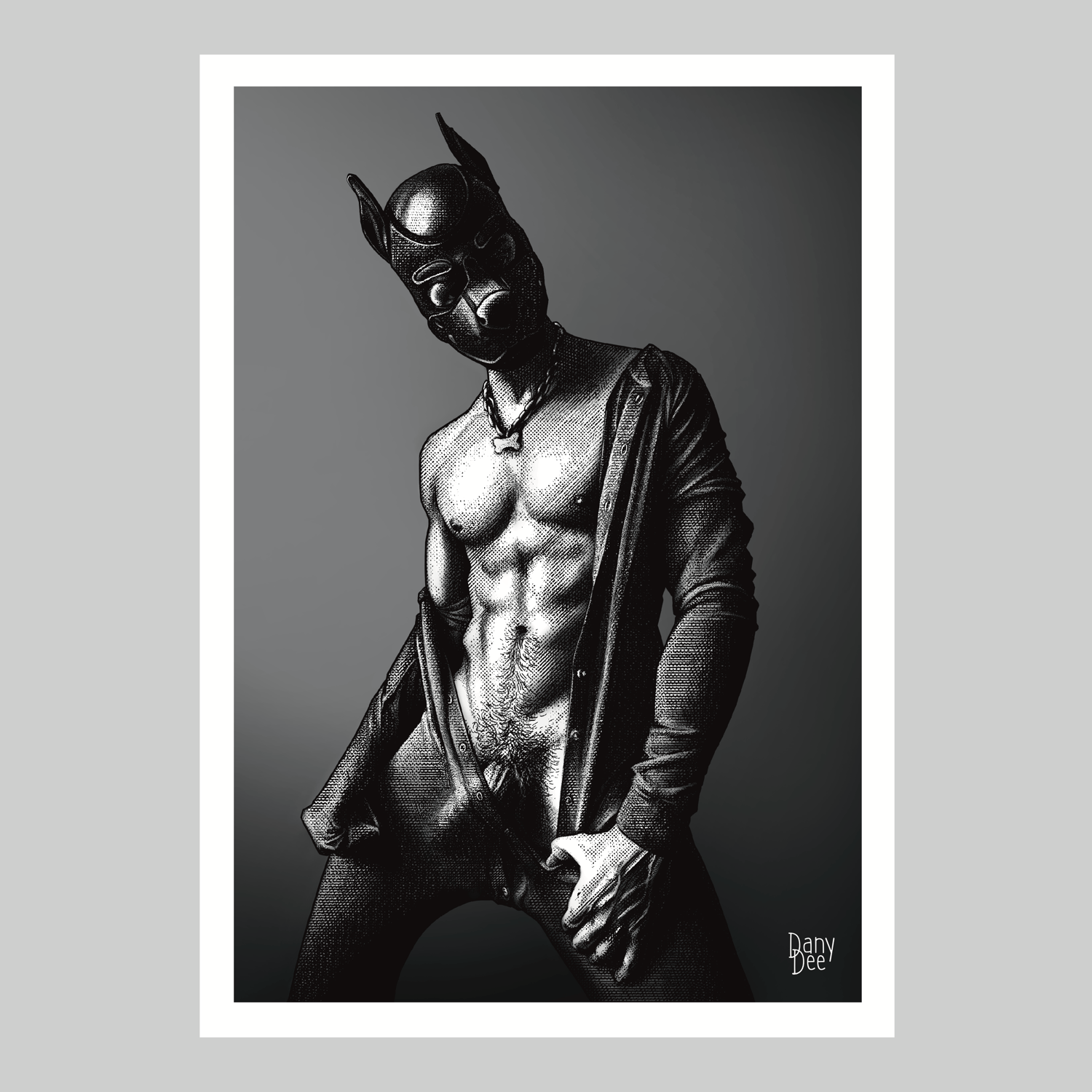"The Puppy" is a hand-drawn, monochromatic A4 art print celebrating gay puppy play culture — a playful yet deeply homoerotic illustration of a young lean man in a pup mask with his pyjama falling open, perfect for gay fetish art collectors or queer home decor.