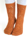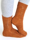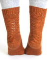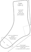 The pattern comes in three sizes (60, 64, and 68 stitches) and with two toe options. Both foot and leg length are adjustable within the stitch pattern. Right and left socks are mirror images of each other and can be worked two at a time.