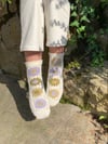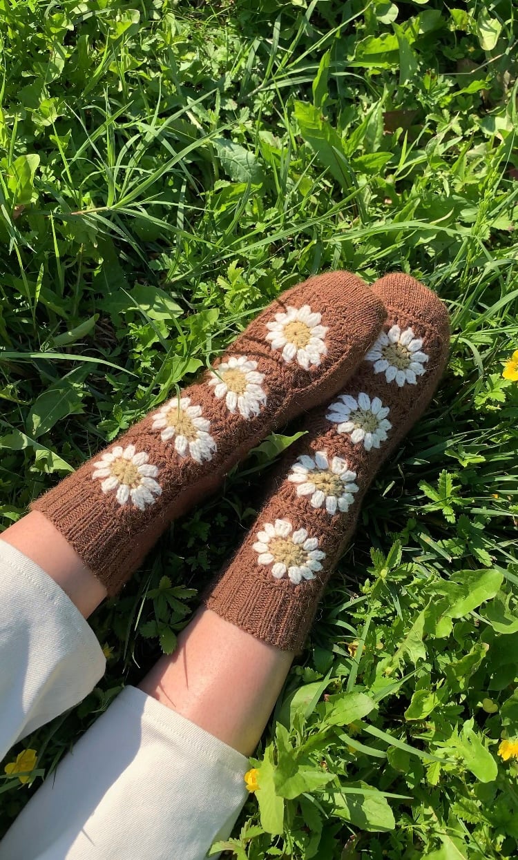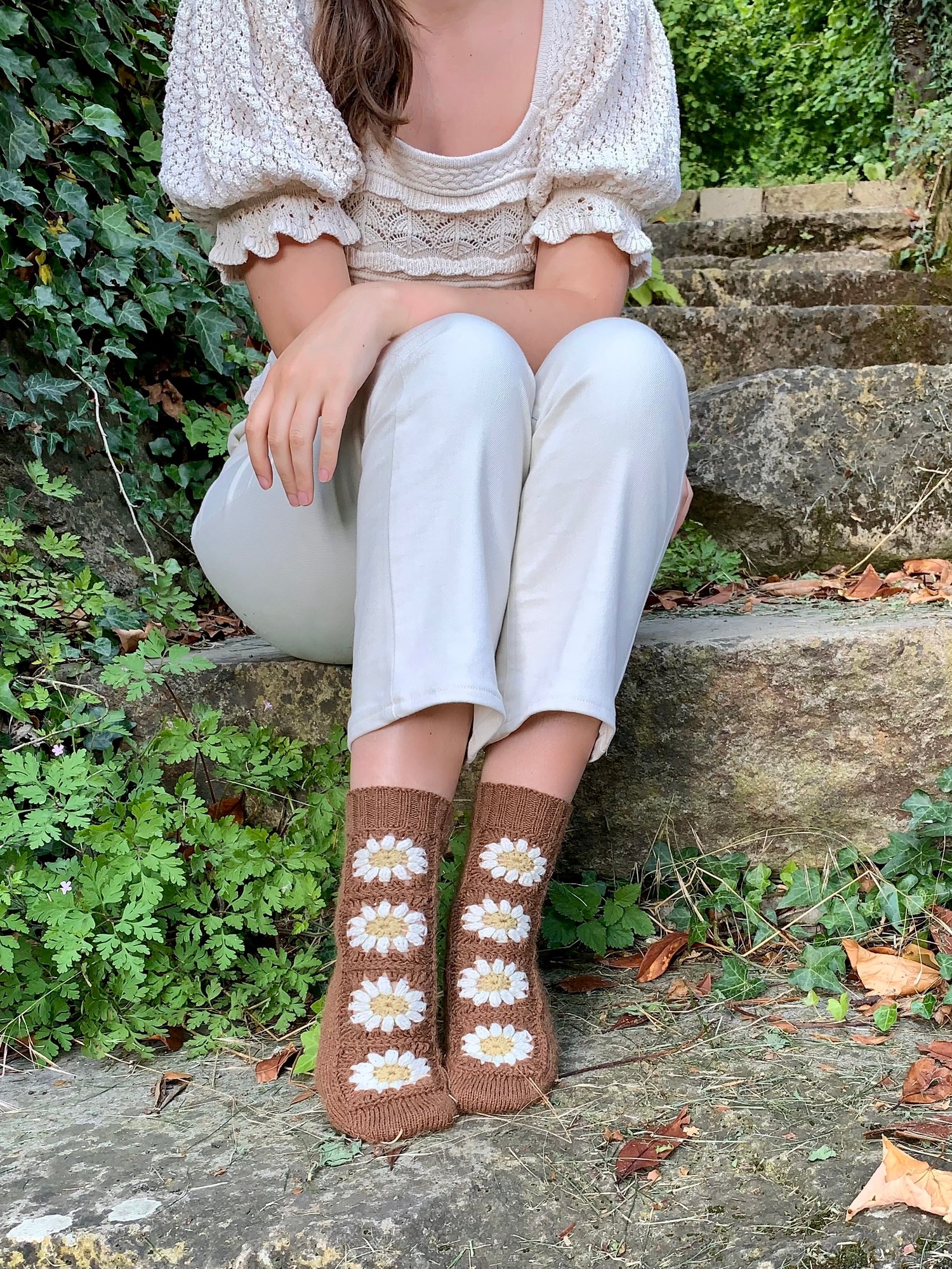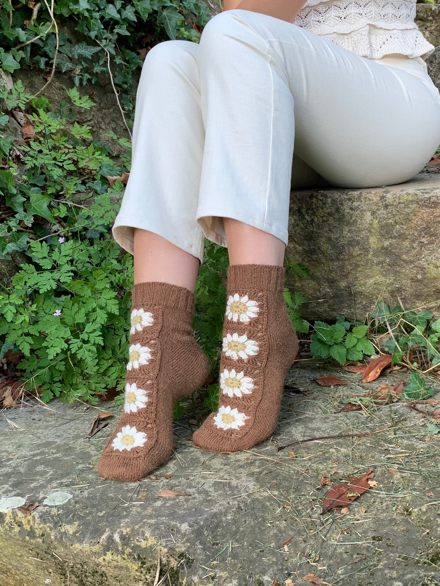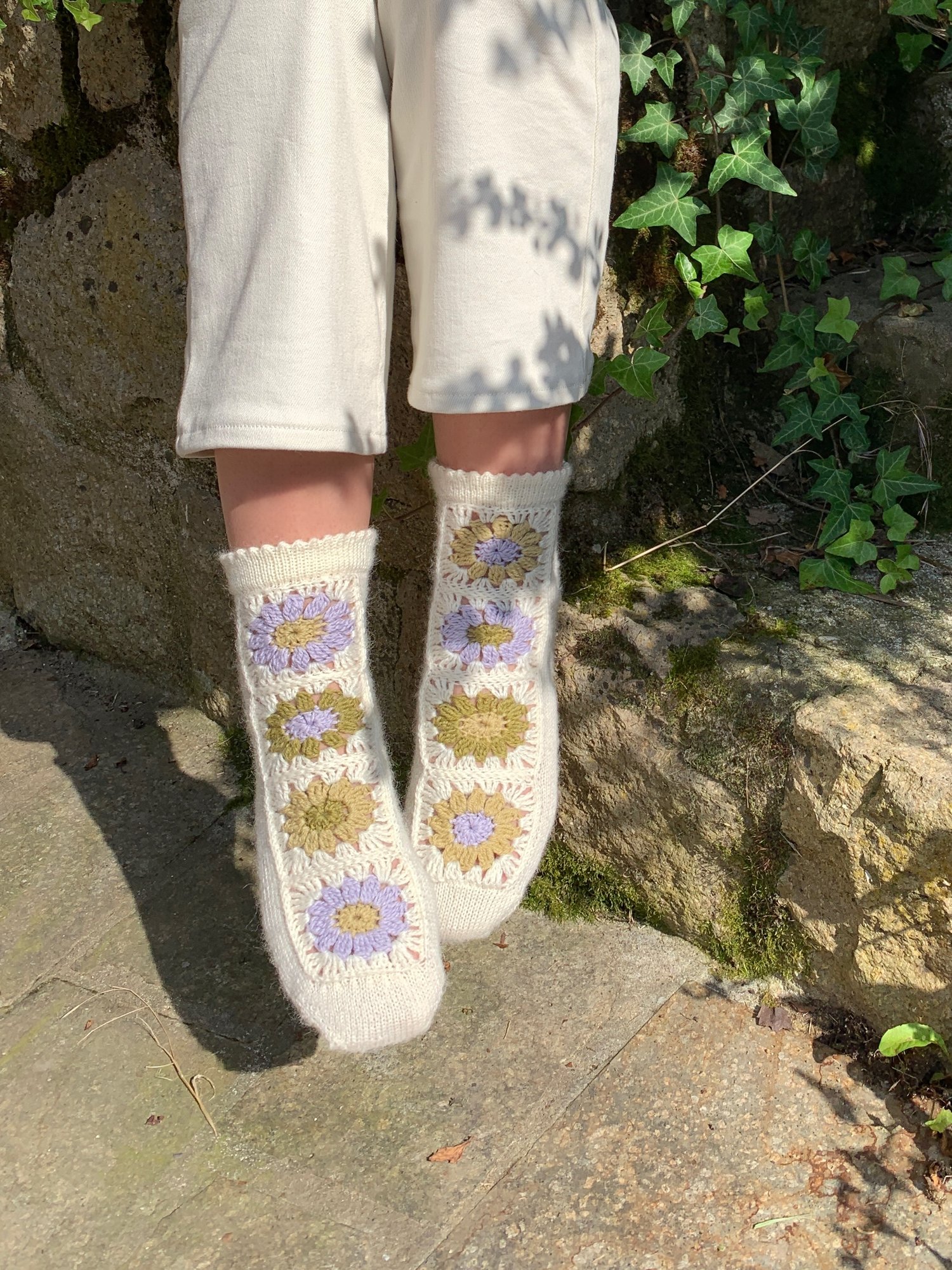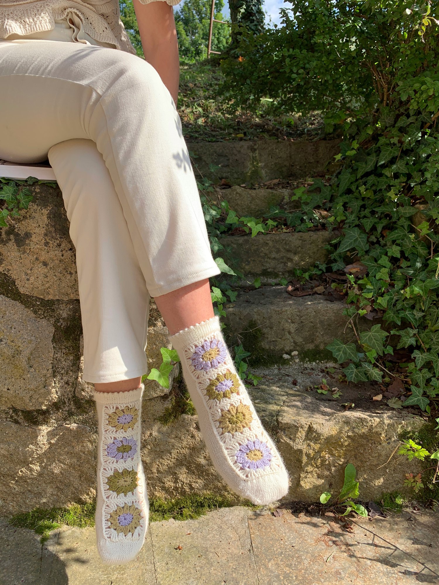 The Granina Socks are worked by first crocheting and assembling granny squares into two strips. The socks are then worked individually by beginning to work the toe in the round. The foot, Fleegle heel, and leg are then knit back and forth while joining the granny square strip seamlessly to the knitted work using modular knitting techniques. The sock is then finished in the round to work a 2x2 ribbed cuff (Version 1), or a picot edge folded cuff (Version 2).