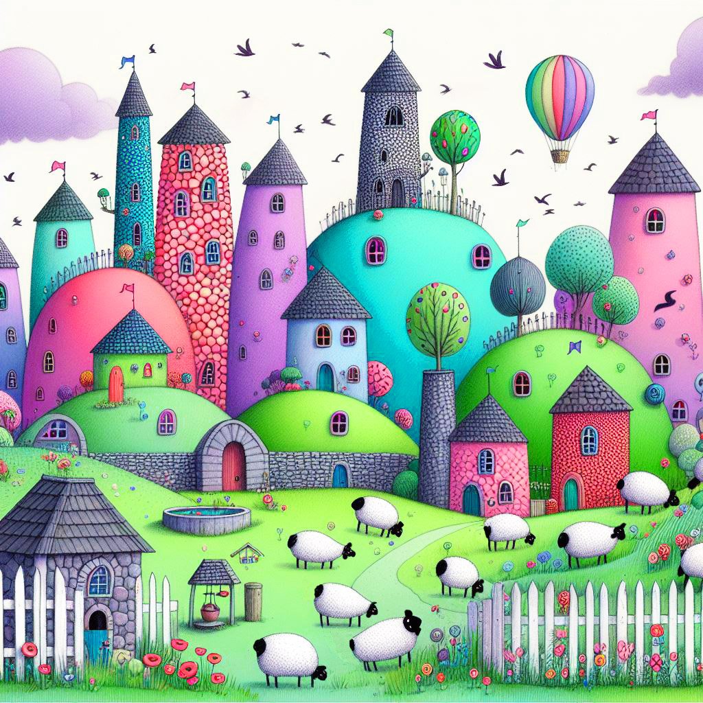 A whimsical world. Lots of tall round houses made of bright colourful pebbles with white picket fences. fields with black & white sheep. There are big round hills with poppies & a hot air balloon. There are birds flying in a cloudy purple sky.