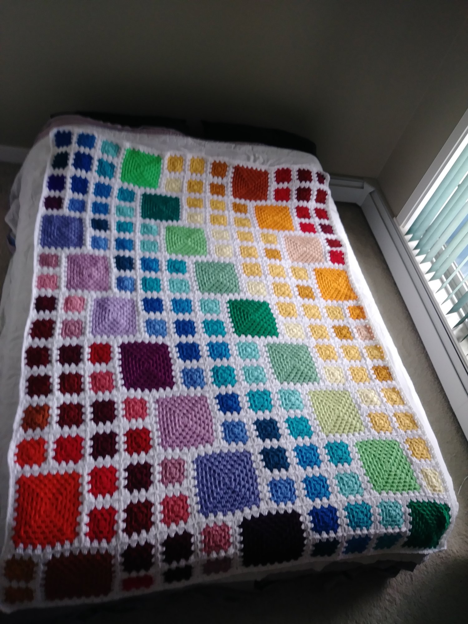 This was designed with using up scraps in mind. Gauge isn’t critical, as granny squares are quite forgiving. Suggested sizes are based on using sport weight yarn vs. worsted weight yarn.