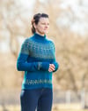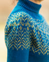 This pullover is worked top down with a circular colorwork yoke. Short row shaping is used to shape the neck. Sleeves are shaped with decreases and include colorwork, too. The length of the sweater can be easily modified. The turtle neck can be easily modified to crew neck, both options are included in the instructions.
