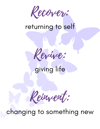 Recover-revive-reinvent is a guided 14-day journal of self-reflection designed to help you answer some important questions. There are affirmations, quotes, poems and valuable information included, to help you on your journey to self-discovery.