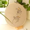 Bordado sobre tela de algodón en bastidor de 24cm, técnica mixta (hilo negro y pintura acrílica).
