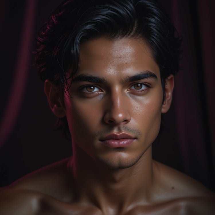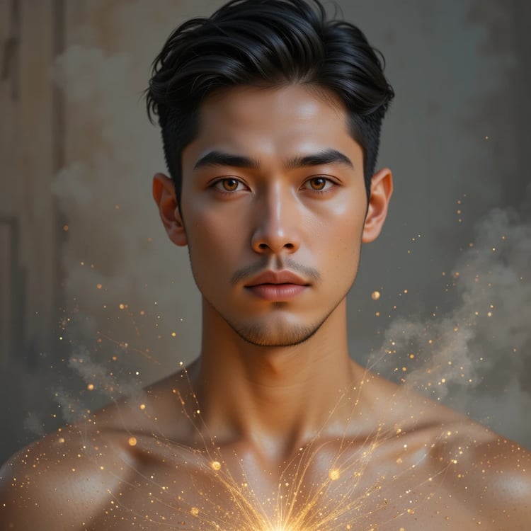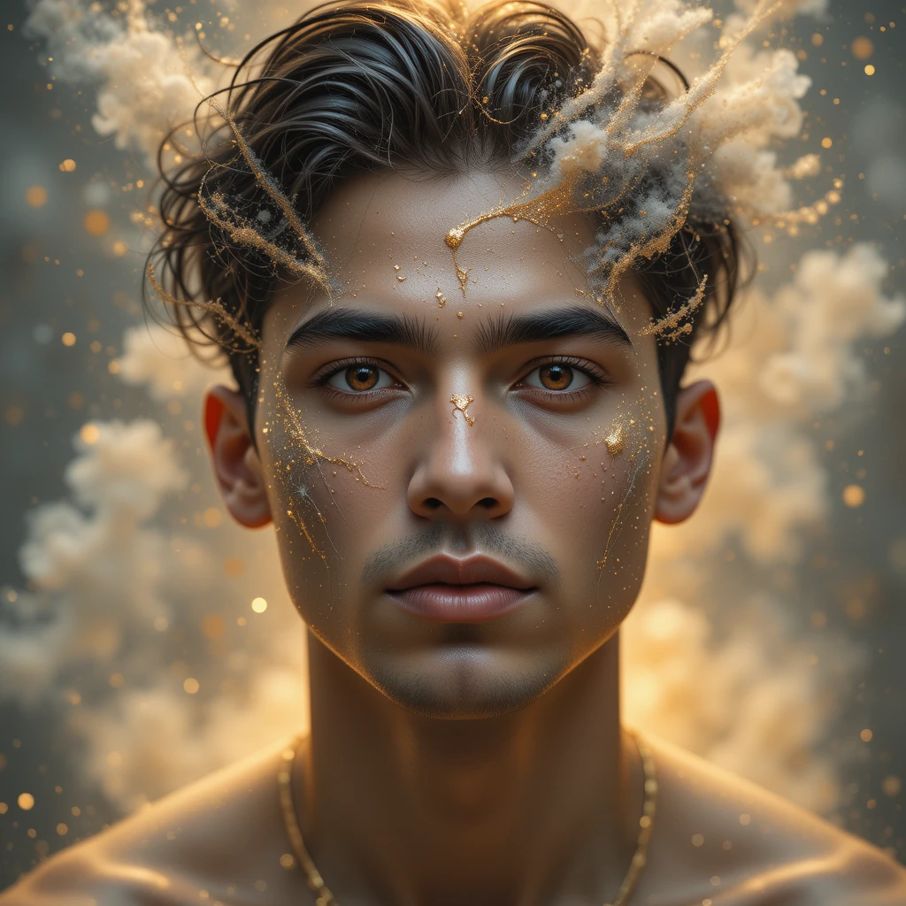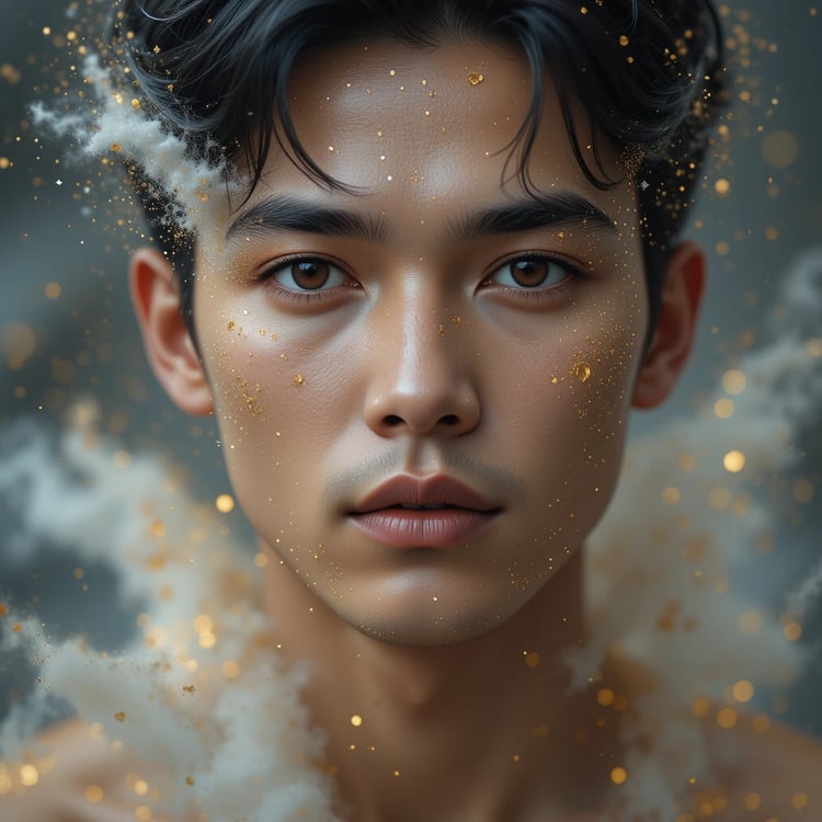Release of Truth is a dramatic, high-resolution digital artwork created by Æther天神. A beautifully tense portrait of a Latin mixed-race male carrying the weight of dust on his shoulders. His jaw is set, his gaze unwavering. This is the moment before release—where the truth begins to rise, but the heaviness still clings.