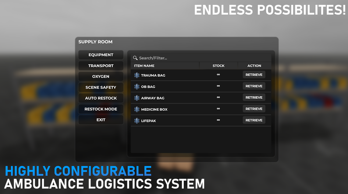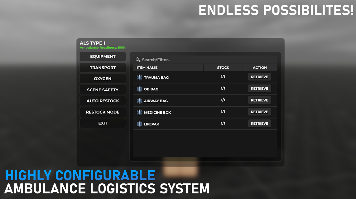 A realistic and interactive inventory management system for emergency medical vehicles. Track equipment stock levels across multiple compartments with real time updates and a color coded readiness indicator. Players can retrieve medical supplies, manually restock items, or use auto restock to return all equipment with one click.