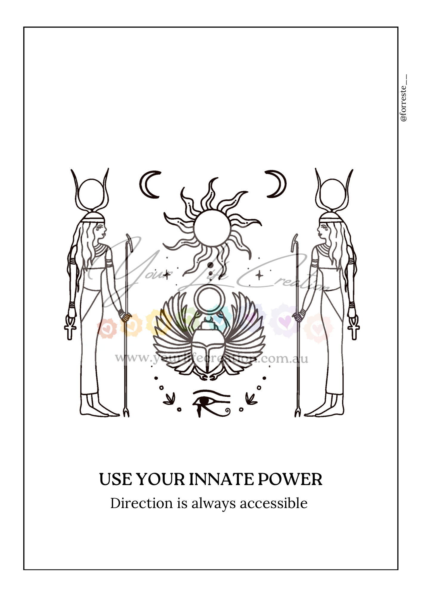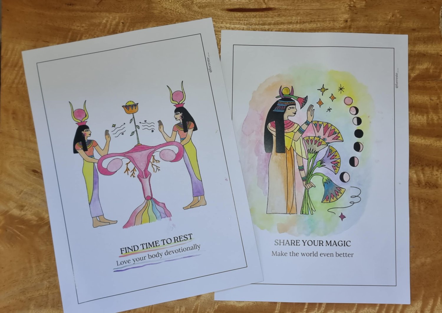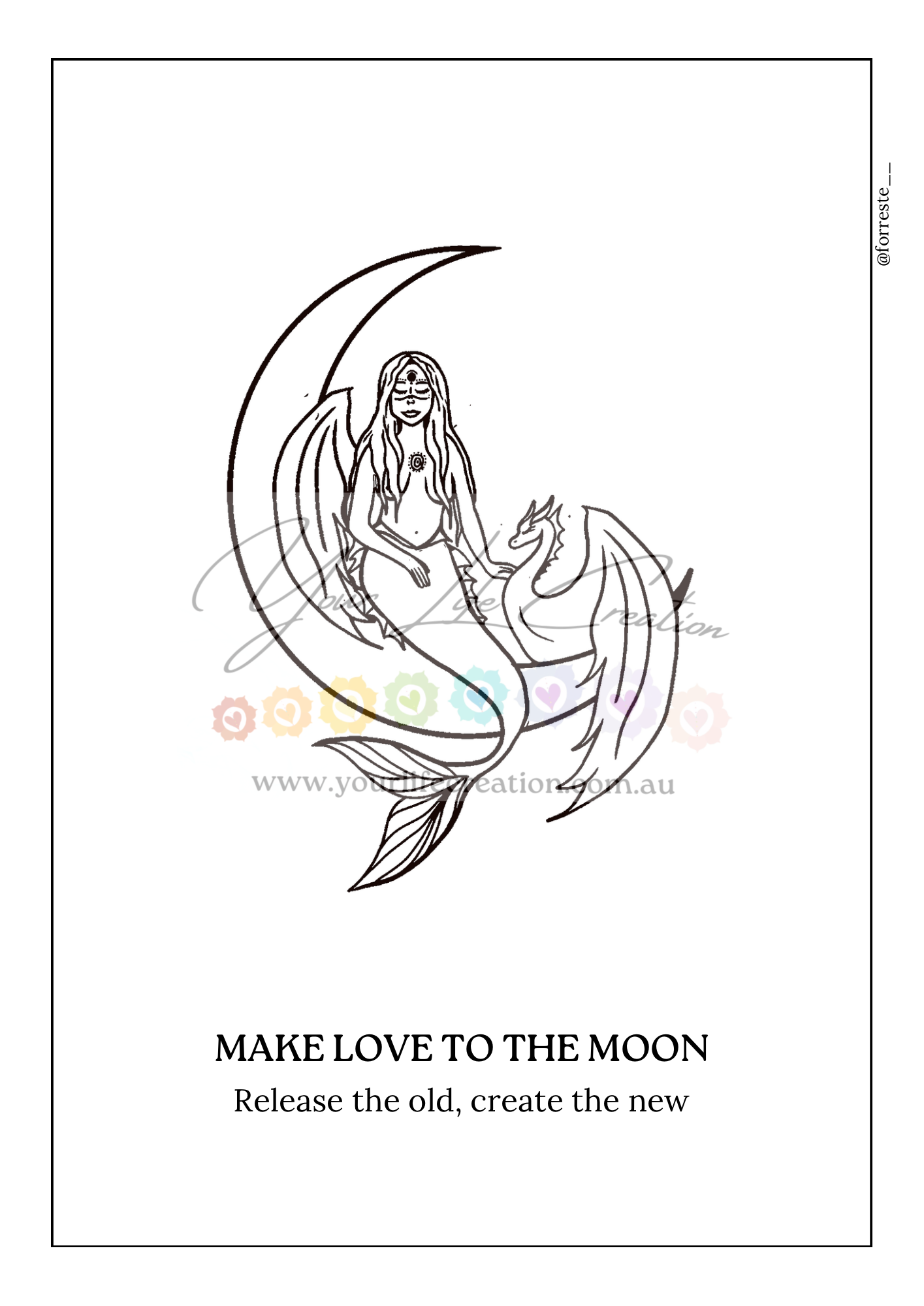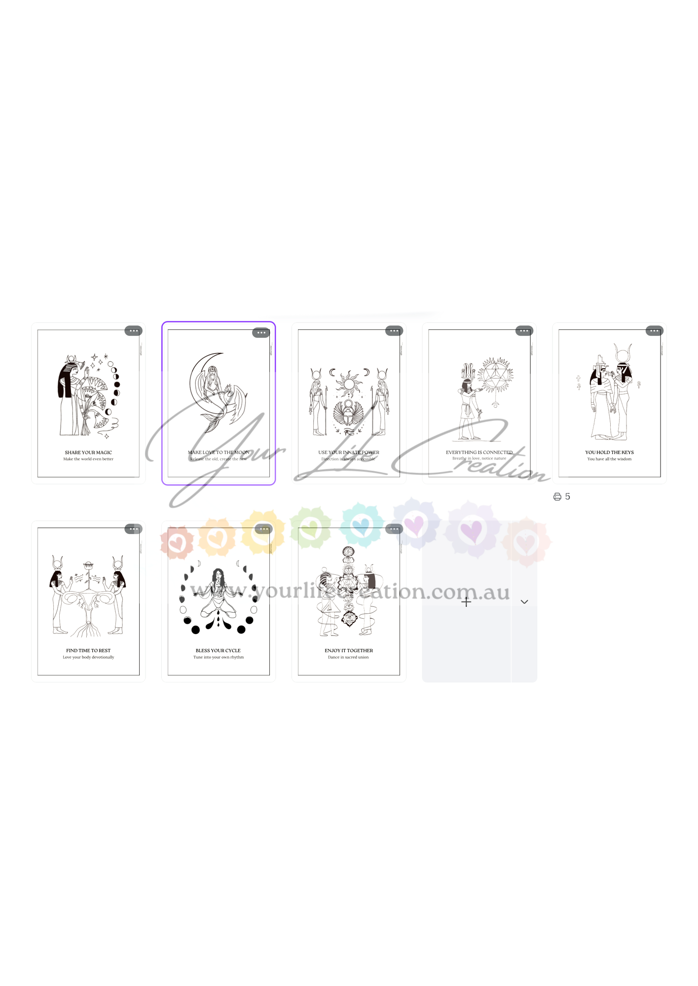 8 Pages where you'll find Ancient Egyptian goddesses, Mermaid Goddesses, Dragons, and symbols such as the Merkabah, the Sun and the Moon, and beautiful feminine drawings to connect with your cycle and your self. Each page has a direction which you can read as a message like a Tarot card. May you notice the synchronicity and truly, the magic!