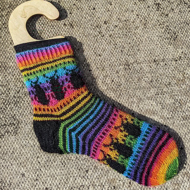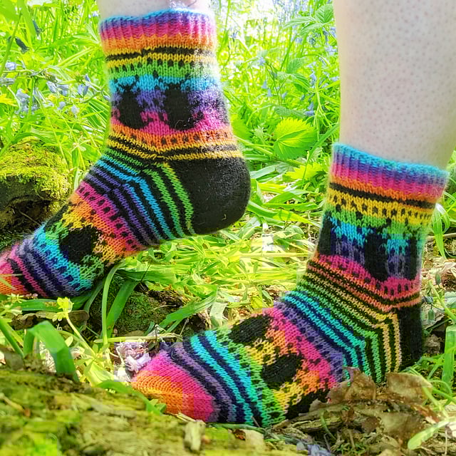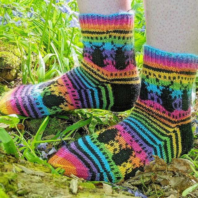 This cuff-down sock combines fun stripes with a stranded colourwork beetle pattern. The main colour yarn works well with multi-coloured sock yarn so enjoy playing with self-striping, variegated and tonal variations. I recommend the CC yarn is a solid which strongly contrasts with your MC for the beetles to really pop. Cuff and toe are knit with MC and the heel flap and heel are knit with CC. Colour work is charted.