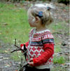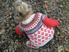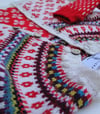Look for a super fine (1) or fingering-weight yarn that knits to 28 stitches in 10 cm on 2.75 mm (US 2, UK 12) needles. I prefer a non-superwash wool that will bloom and blend with the other yarns around it once washed. My sample cardigan uses 2 strands held together of Z. Hinchcliffe & sons Lambswool yarn, (2/17nm; 2-ply; 100% wool) in “tartan red” and “Ecru”. Available at Uppingham yarns (wools.co.uk).