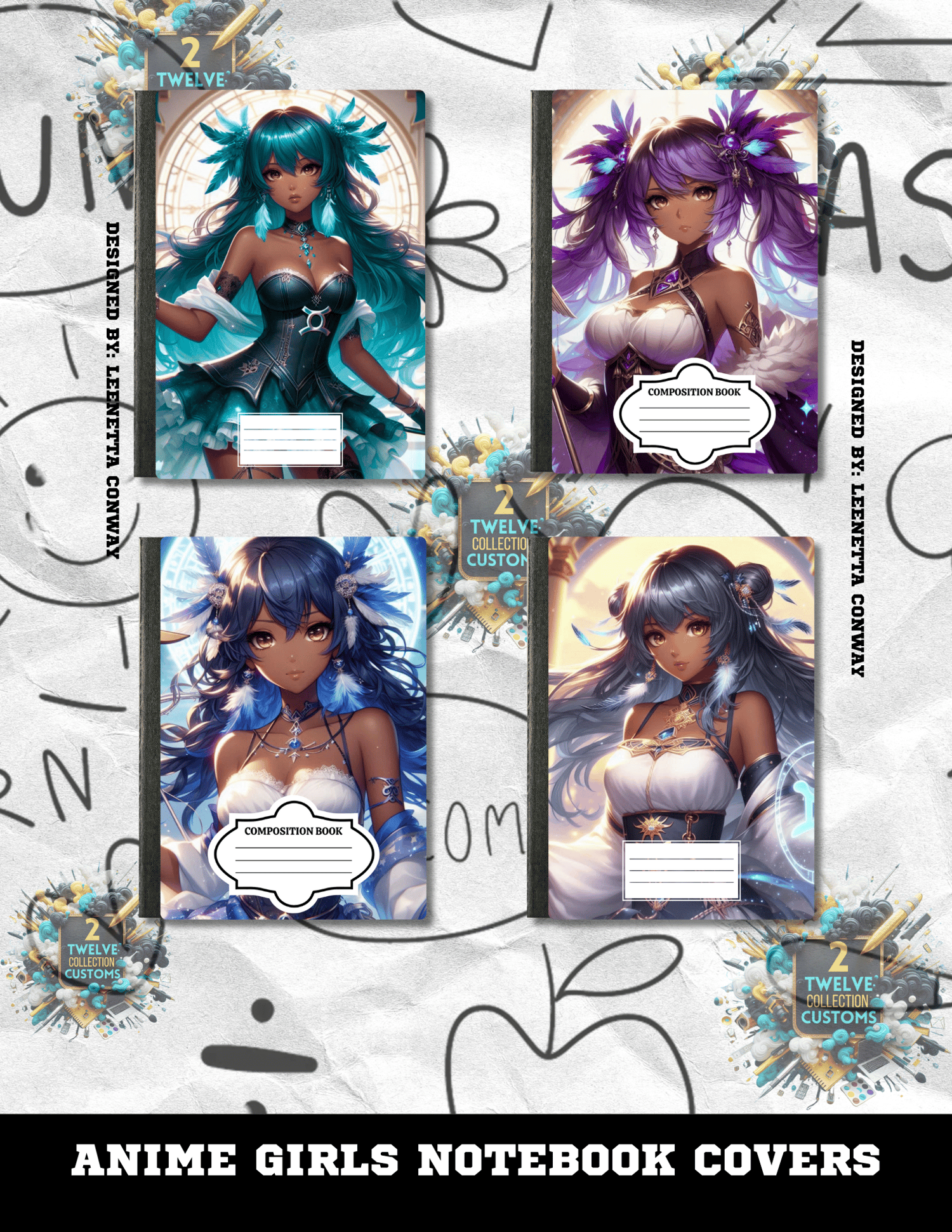 Anime Girls Composition Notebook Covers Canva Template 4 Pack