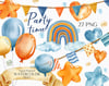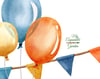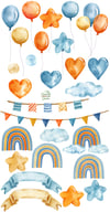 Party decoration elements: balloons, banners, rainbow. Kids birthday and baby shower theme