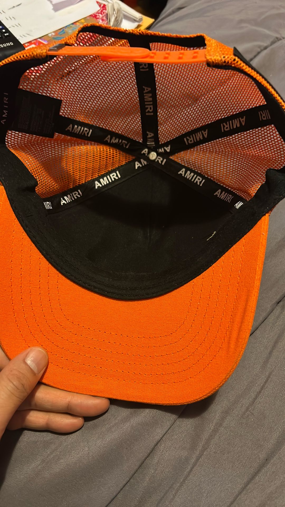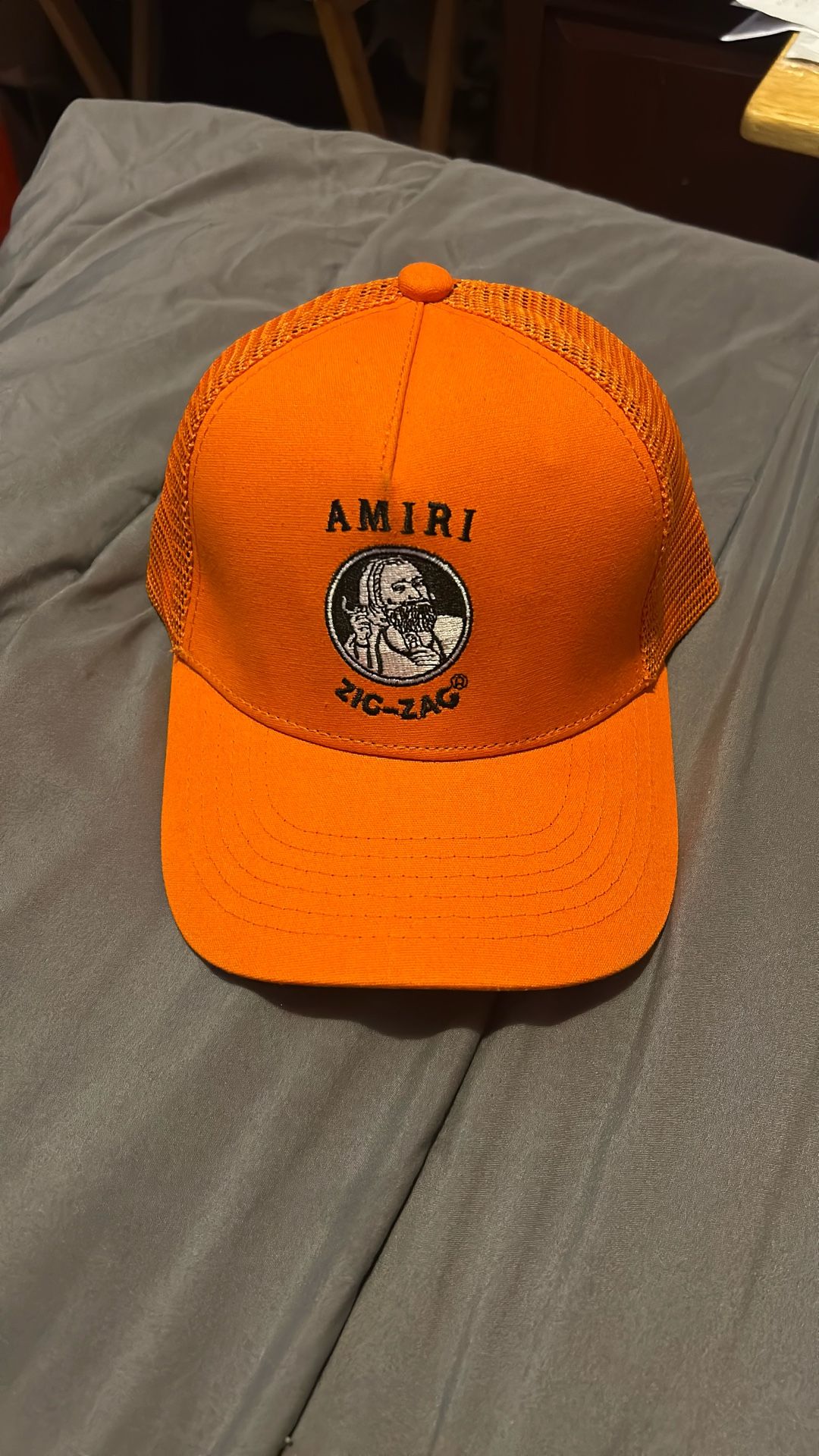 Amiri Orange Zigzag Snapback – Like New (Half Price) Authentic Amiri snapback in a bold orange zigzag design. Premium craftsmanship, structured crown, flat brim, and adjustable snapback closure for a clean, confident fit. Condition: Slightly used – like new. No stains. No fading. No structural wear. Brim is firm, stitching intact, interior clean. Originally retail-priced significantly higher. Now available for $100 — half price. This isn’t a basic cap. It’s high-end street luxury. If you know Amiri, you know the value. Serious buyers only. First come, first served.