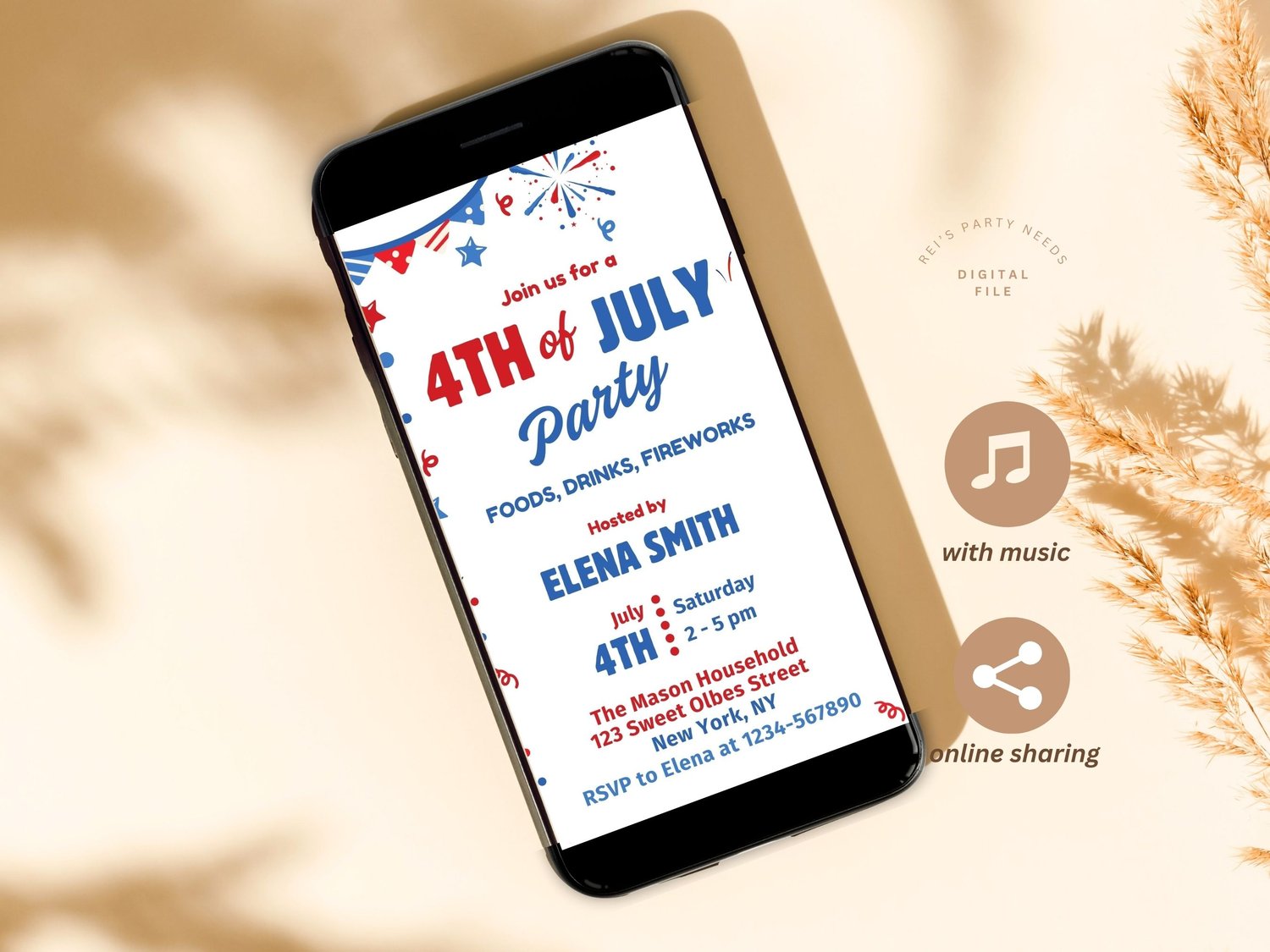 4th of July Party Digital Invitation, Canva 4th of July Video Invitation, Editable Mobile Animated Patriotic Evite, 4th of July Evite White
