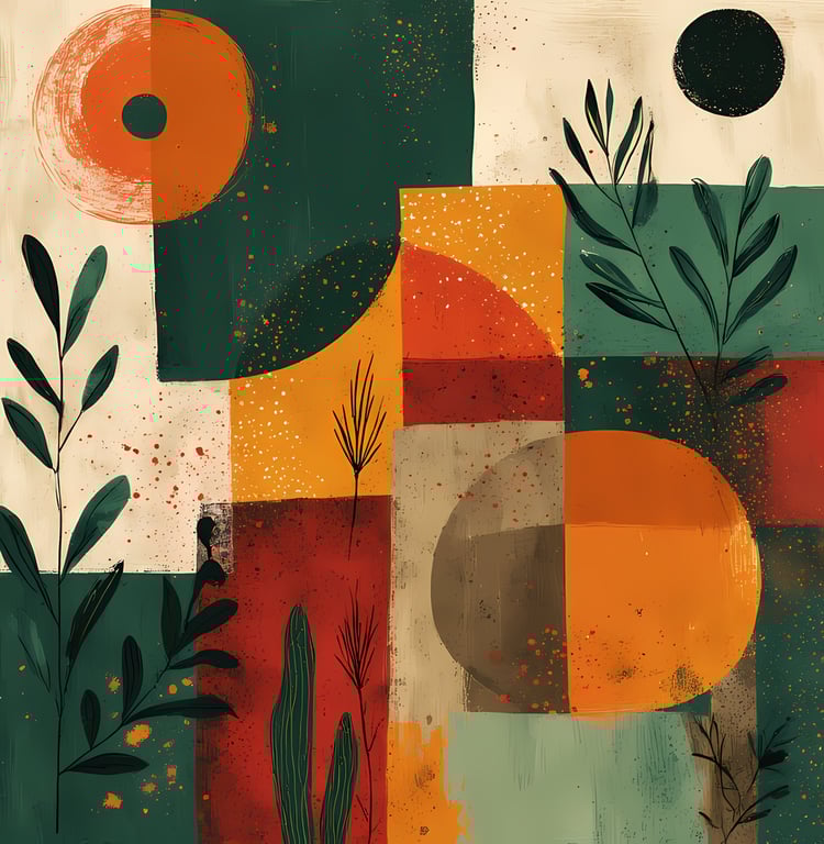 The designs combine geometric shapes with organic elements, creating a modern yet earthy feel. The color palette is centered around rich, warm tones for a contemporary boho look, with hints of dark teal for contrast. Whether you're designing for home décor, branding, greeting cards, or digital art projects, these versatile illustrations will enhance any creative project with their stylish and unique flair.