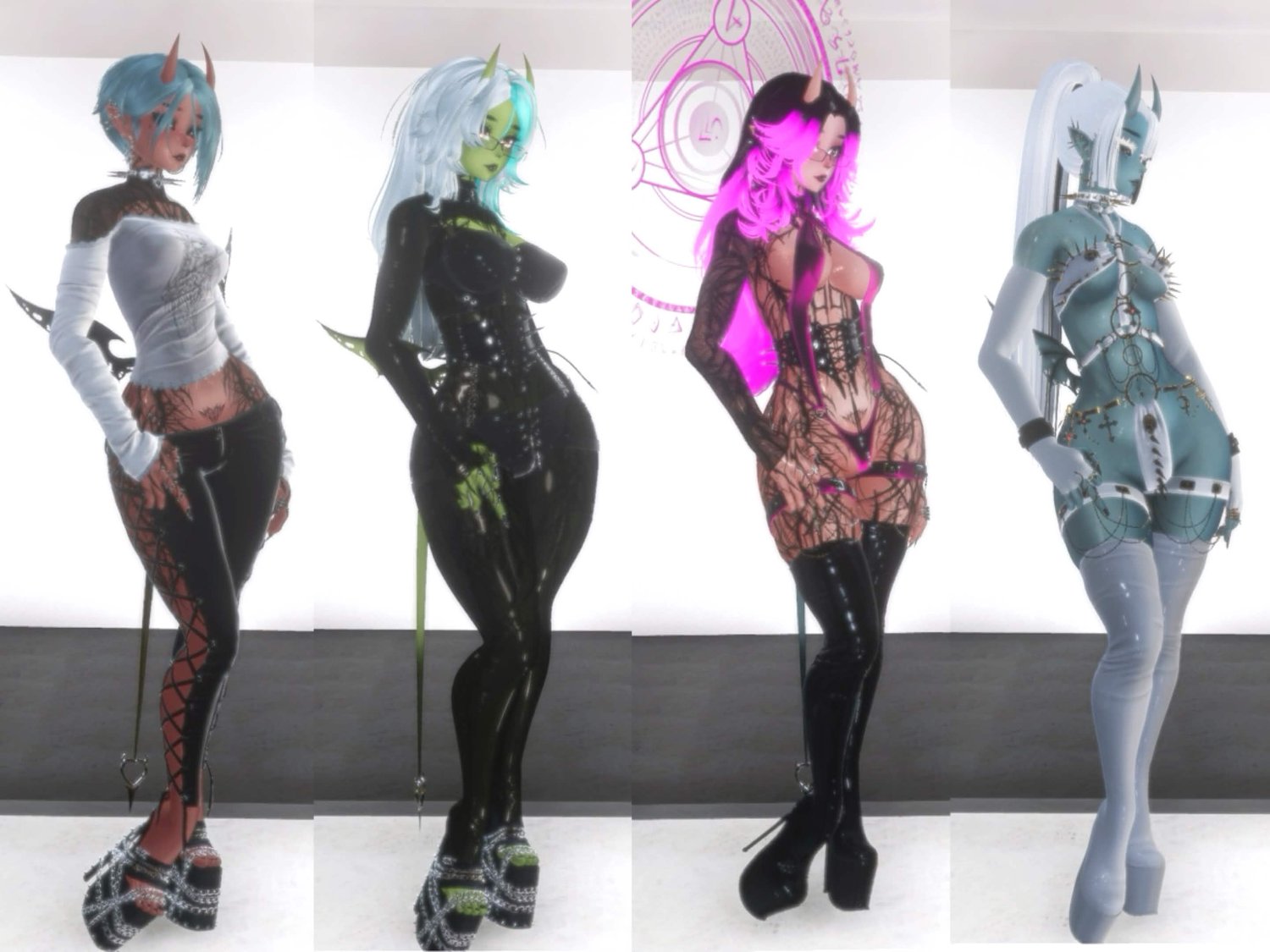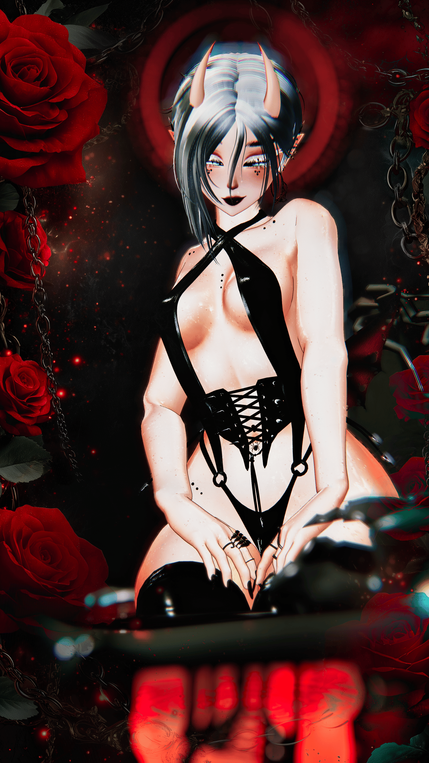 Body by Torinyan (PERSONAL REUSE ONLY)| Face by Starlynn , Sivka (PERSONAL REUSE ONLY)| Face, Body Textures by Ying Yang (Face, Body), Jvliette | Wet skin by VeronicaJae | Catsuit Materials by Flexuh | Tattoos by Zade | Eyes by Eden | Pubes by Zeit | Short hair, Medium Fluffy Hair, Long Wavy Hair by Saikura, Ponytail by Nessy | Hair Textures by Saikura | Casual Fit by Bunisu | Thigh high boots by Wetcat | Chain heels by Aika | Bikini, Fishnet Top by Beanie Baby | Corset by CompelledInk | Pants by Deimos | Tease Set by Nessy | Cuffs by Miriammm | Wings, tail by TheThiccWitch | Nipple Piercings by AgentM | Nail jewelry by Eggyu | Rings by Holoexe , Milkymutt | Glasses by Xero | Face gems by Blood | Anti Halo by SmolUni | Choker by Naku | Earrings by BeanieBaby | Spider hoops by Tij | Spider belly ring by Sache | Body piercings by Emchie | Attachment by Wholesome | SPS Configurator by Wholesome | Avatar Limb Scaling by Nanochip | Fake Index Gestures by Snoww | Icons by Awmi, DontJinxIt, IconGen | Gogo Loco by Franada