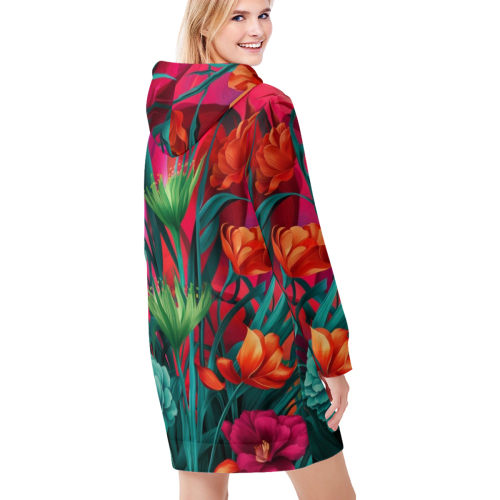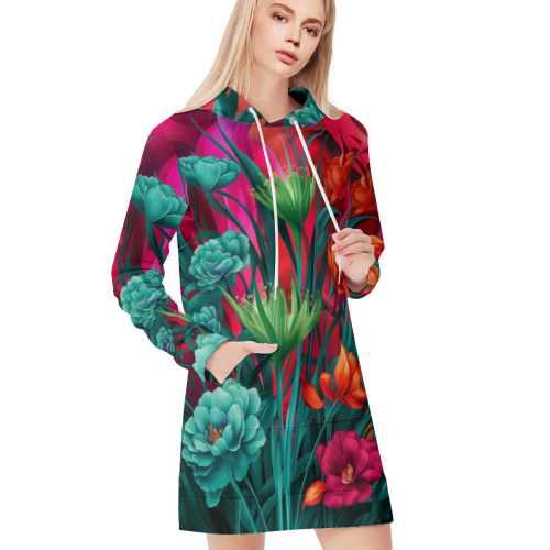 floral hoodie dress, women’s casual hoodie dress, long sleeve hoodie dress, all-over print dress, floral sweatshirt dress, colorful hoodie dress, streetwear for women, comfy floral dress, casual fall fashion, hoodie dress with pockets, unique women's hoodie, bright floral hoodie, polyester hoodie dress