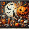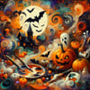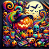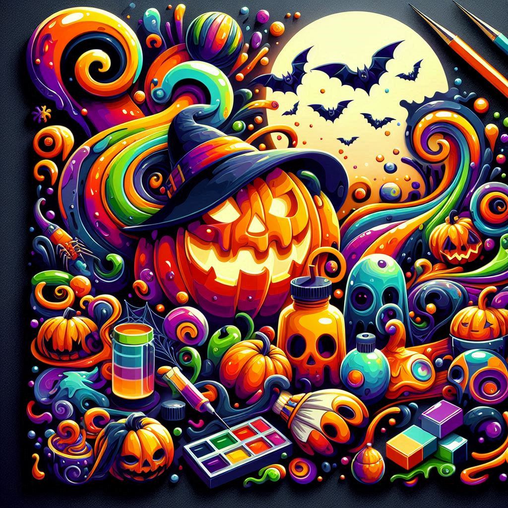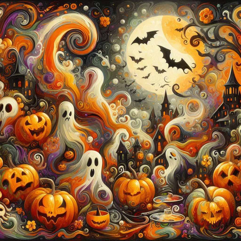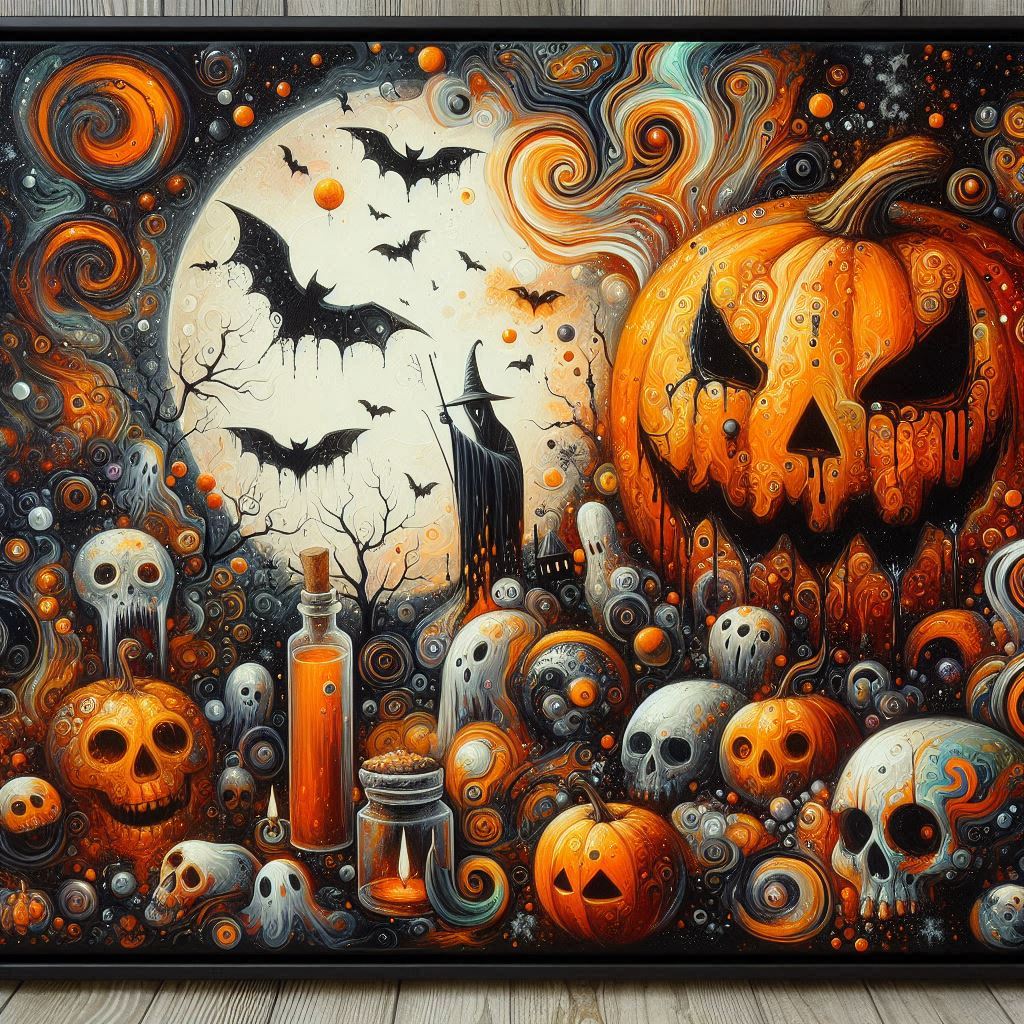 Description: A mesmerizing swirl of fluid colors brings pumpkins to life in this haunting abstract. Each gourd glows with eerie shades of orange, green, and violet, merging and drifting like spectral mist across a moonlit landscape. The scene pulses with the mysterious energy of Halloween, evoking both beauty and unease in its ghostly vibrancy.