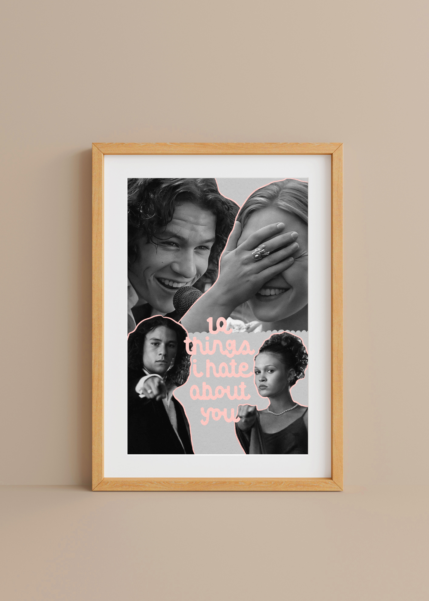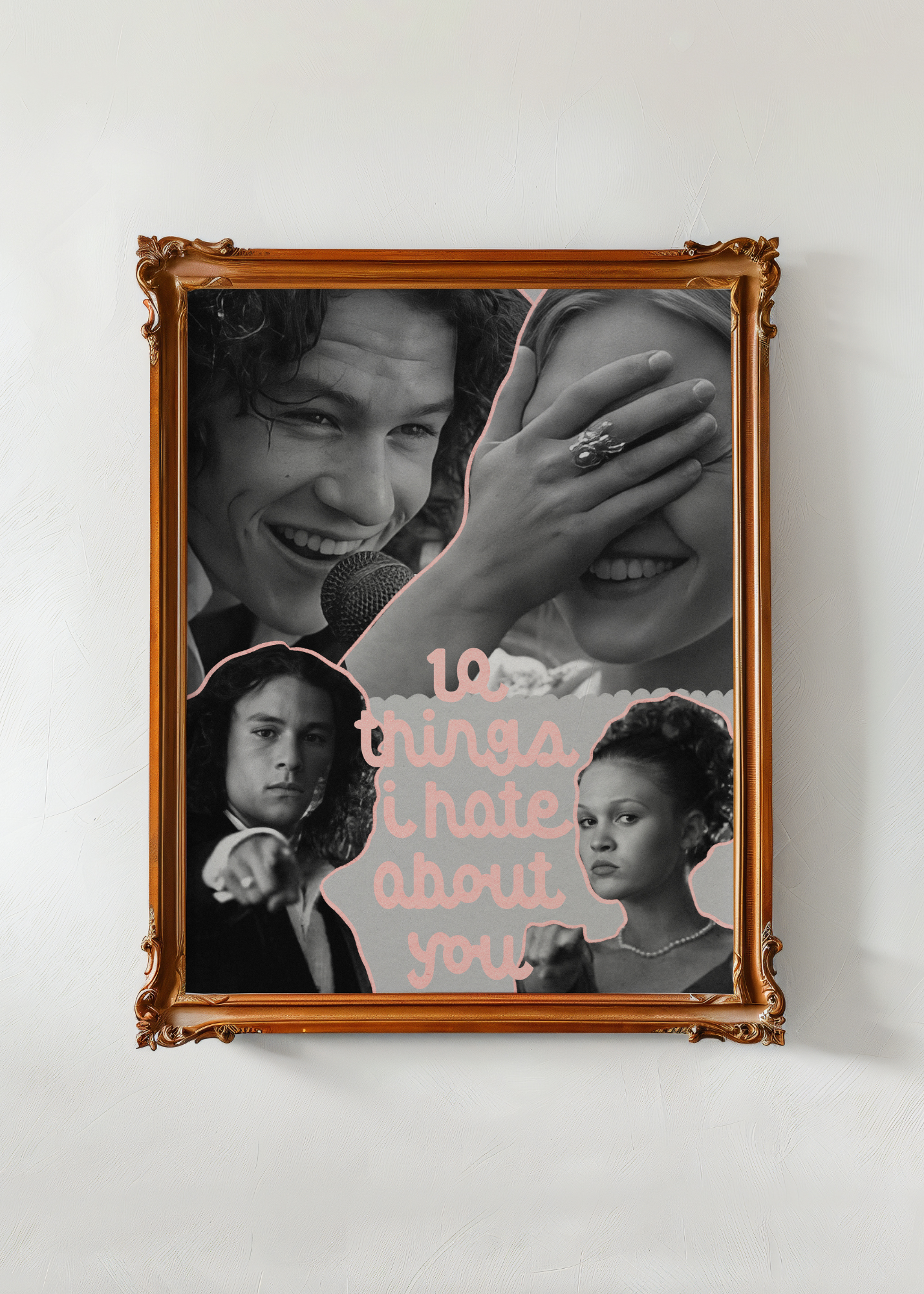 10 Things I Hate About You— A love letter to the unforgettable chaos and charm of teenage hearts. This print features Kat, Patrick— the iconic cast of 10 Things I Hate About You, captured in dreamy black and white with playful pink accents. It celebrates rebellion, romance, and those moments of vulnerability that make us feel deeply seen. A spirited tribute to a film that made us all believe in poetry, paintball dates, and love found in unexpected places.