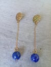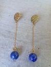 Boucles d’oreilles pendantes en lapis-lazuli, finition dorée, au design épuré et raffiné. Une création intemporelle qui allie élégance et profondeur, pour celles qui souhaitent exprimer leur vérité avec assurance et sérénité.