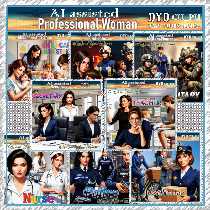 this pack contains : 03 childcare assistants, 03 firefighters, 03 militarys, 03 nurses, 03 police women, 03 postwomen, 03 secretarys and 03 teachers.