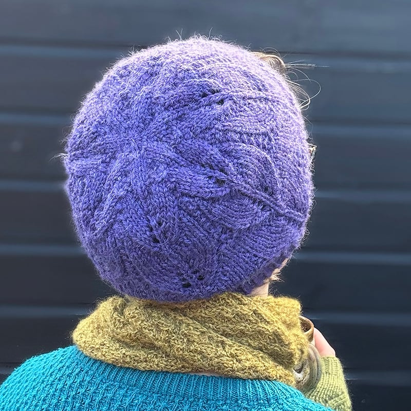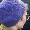 Ayr is knit from the bottom up in DK yarn and is sized from toddler to large adult. The pattern consists of simple lace stitches on every other row and moss stitch. As the ‘leaves’ grow up the hat they gradually get smaller and decrease into a flower shape on the crown. The pattern is both written and charted.
