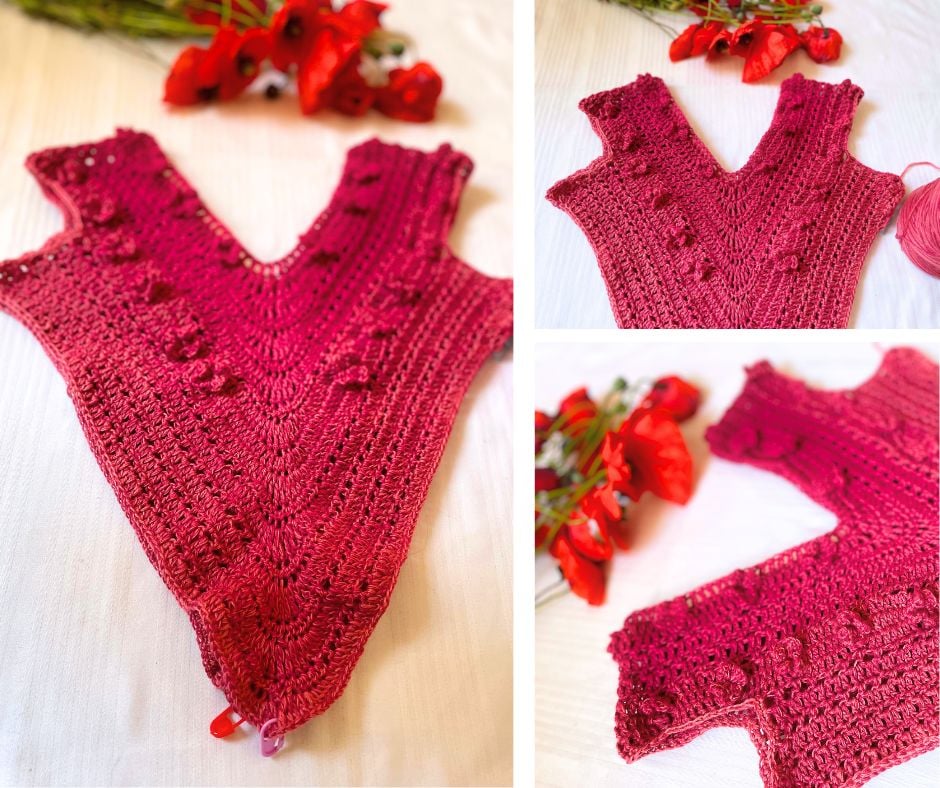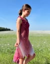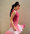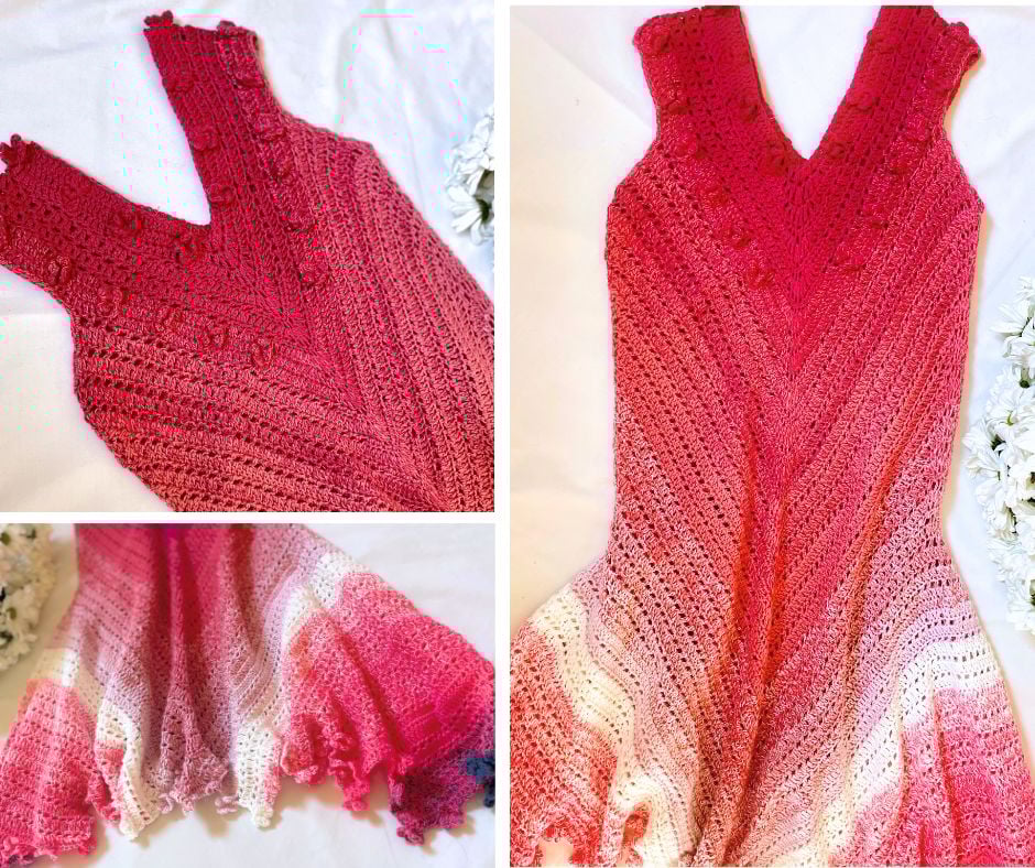 Každá háčkovaná část odhaluje nový odstín, což šatům dodává jedinečný a nádherně vybarvený vzhled.