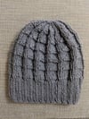 This Geeky hat is inspired by the Schrodinger’s cat thought experiment. The textured pattern is made up of squares that are half garter stitch and half stocking stitch, representing the cat in the box that could be both dead and alive.