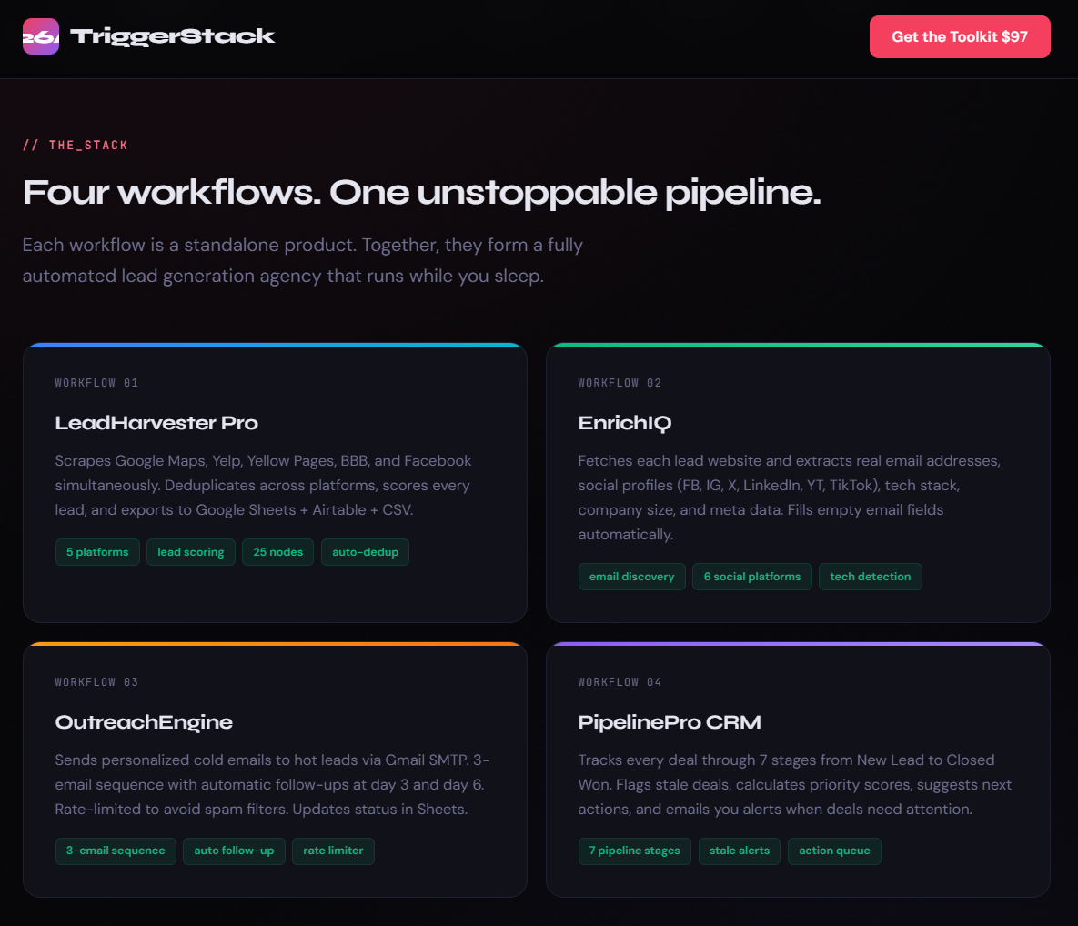 The TriggerStack Lead Gen Agency Toolkit is a complete, end-to-end lead generation system built entirely in n8n. Four workflows. 64 nodes. Zero monthly cost. Import the JSON files, follow the setup guide, and you'll have a fully automated pipeline scraping, enriching, emailing, and tracking leads — all on autopilot.