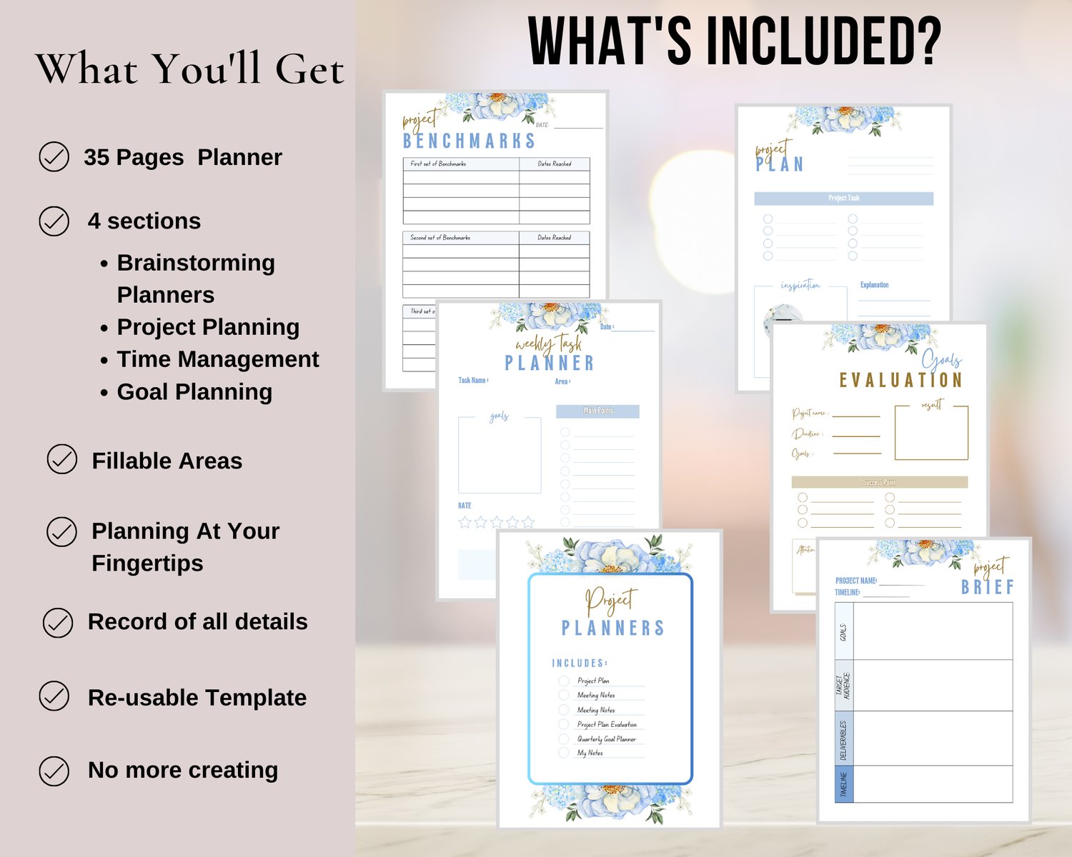 📝 Project & Goal Planner | Printable Happy Planner BIG & Classic Sizes | 35-Page Productivity Bundle | Brainstorming, Project, Time & Goal Planning