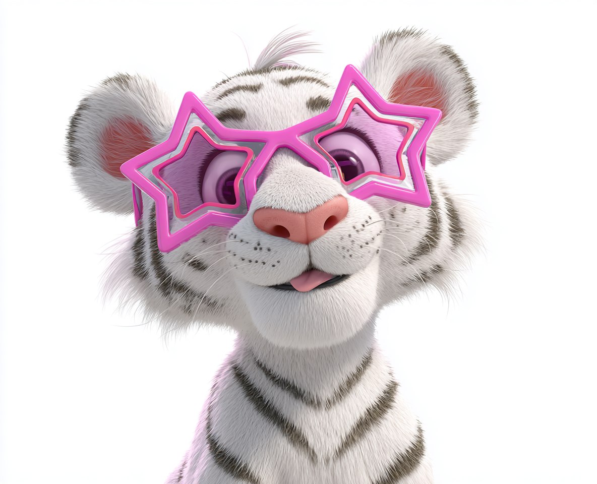 - White tiger cub, wearing pink star-shaped sunglasses