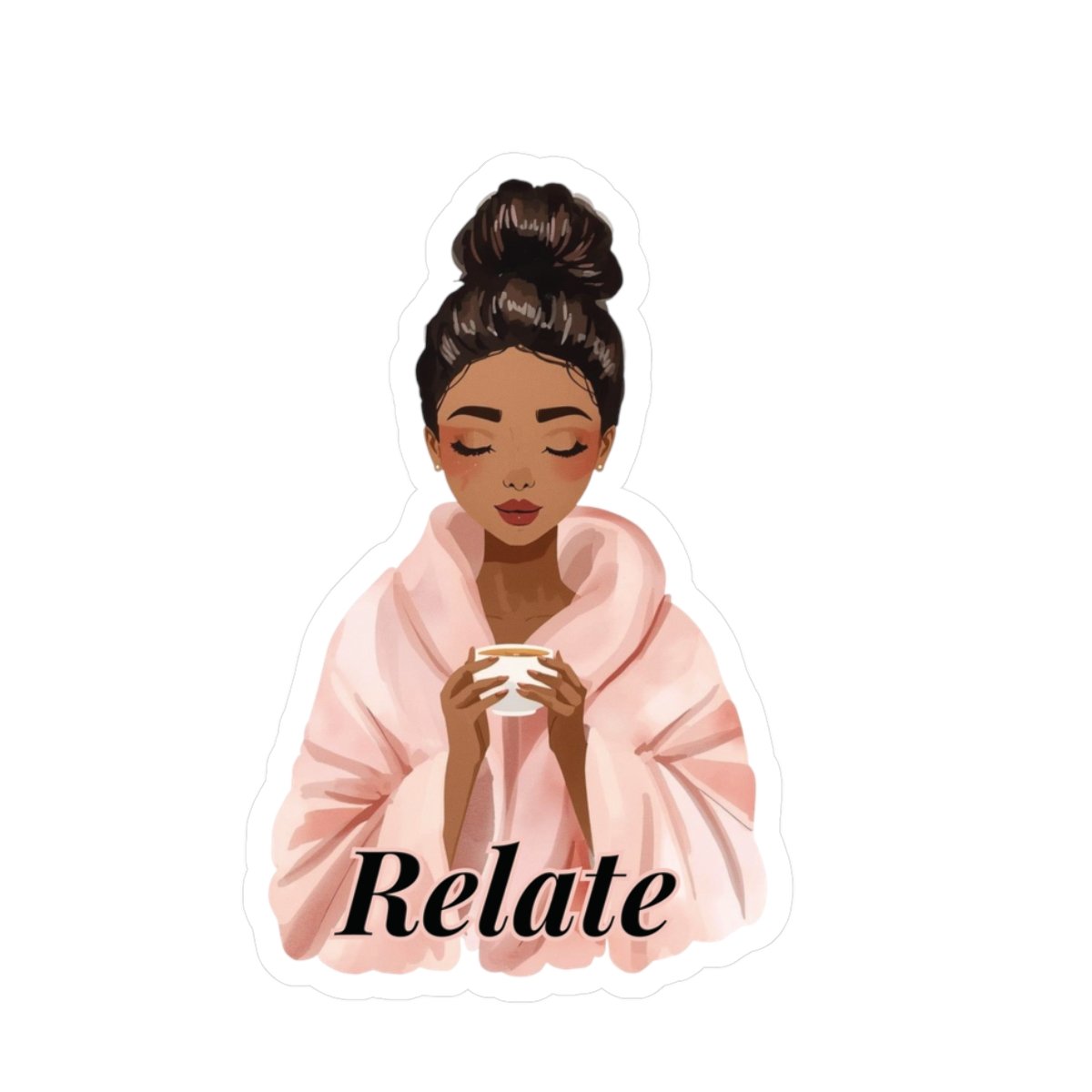 This Relate Sticker features a peaceful woman wrapped in a soft pink robe, gently holding a warm cup. The design symbolizes empathy, understanding, and shared peace—perfect for anyone who values emotional connection and mindful living.