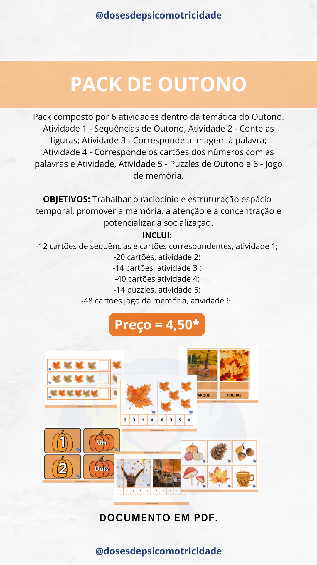Atividade 1 - Sequências de Outono, Atividade 2 - Conte as figuras; Atividade 3 - Corresponde a imagem á palavra; Atividade 4 - Corresponde os cartões dos números com as palavras e Atividade, Atividade 5 - Puzzles de Outono e 6 - Jogo de memória.