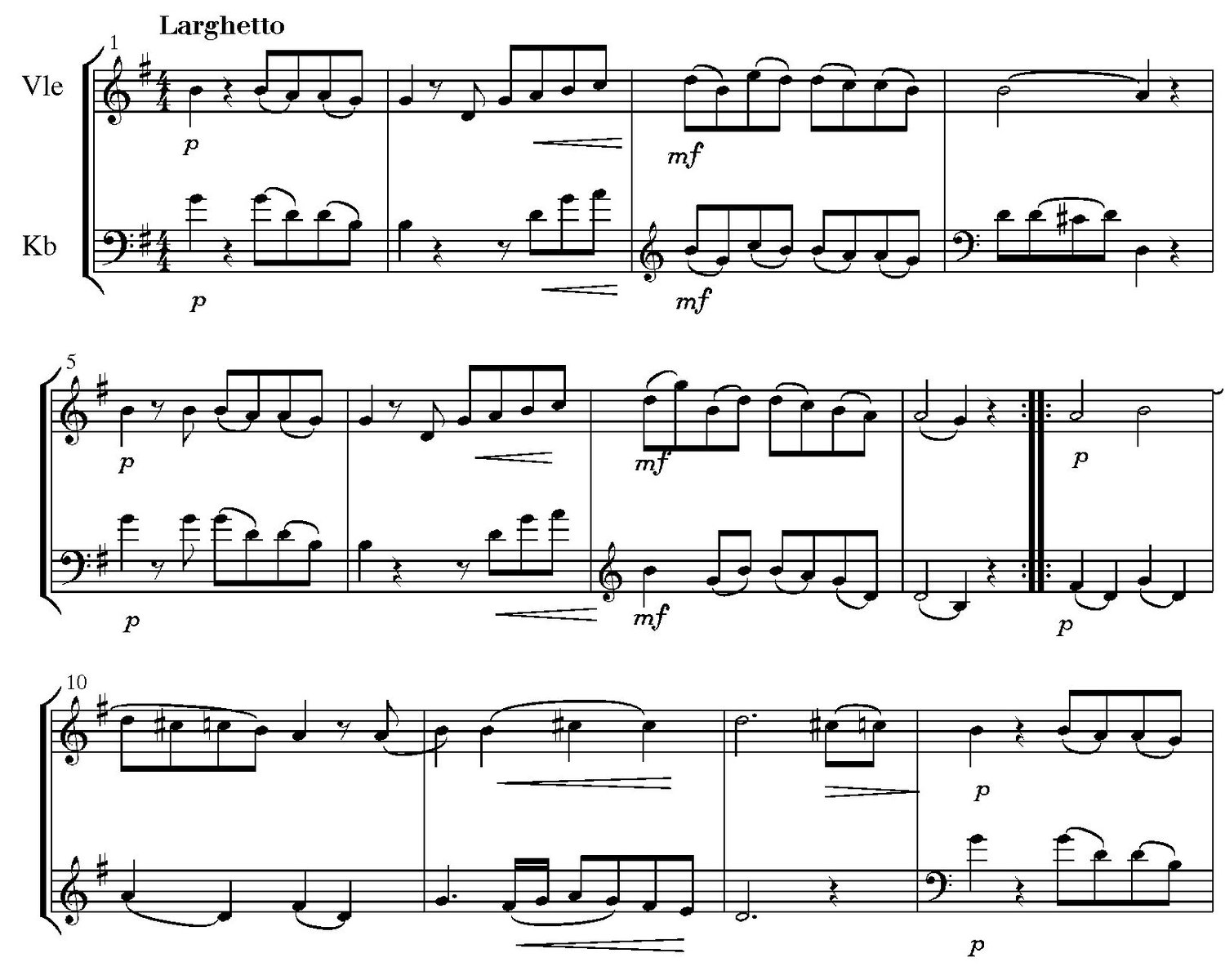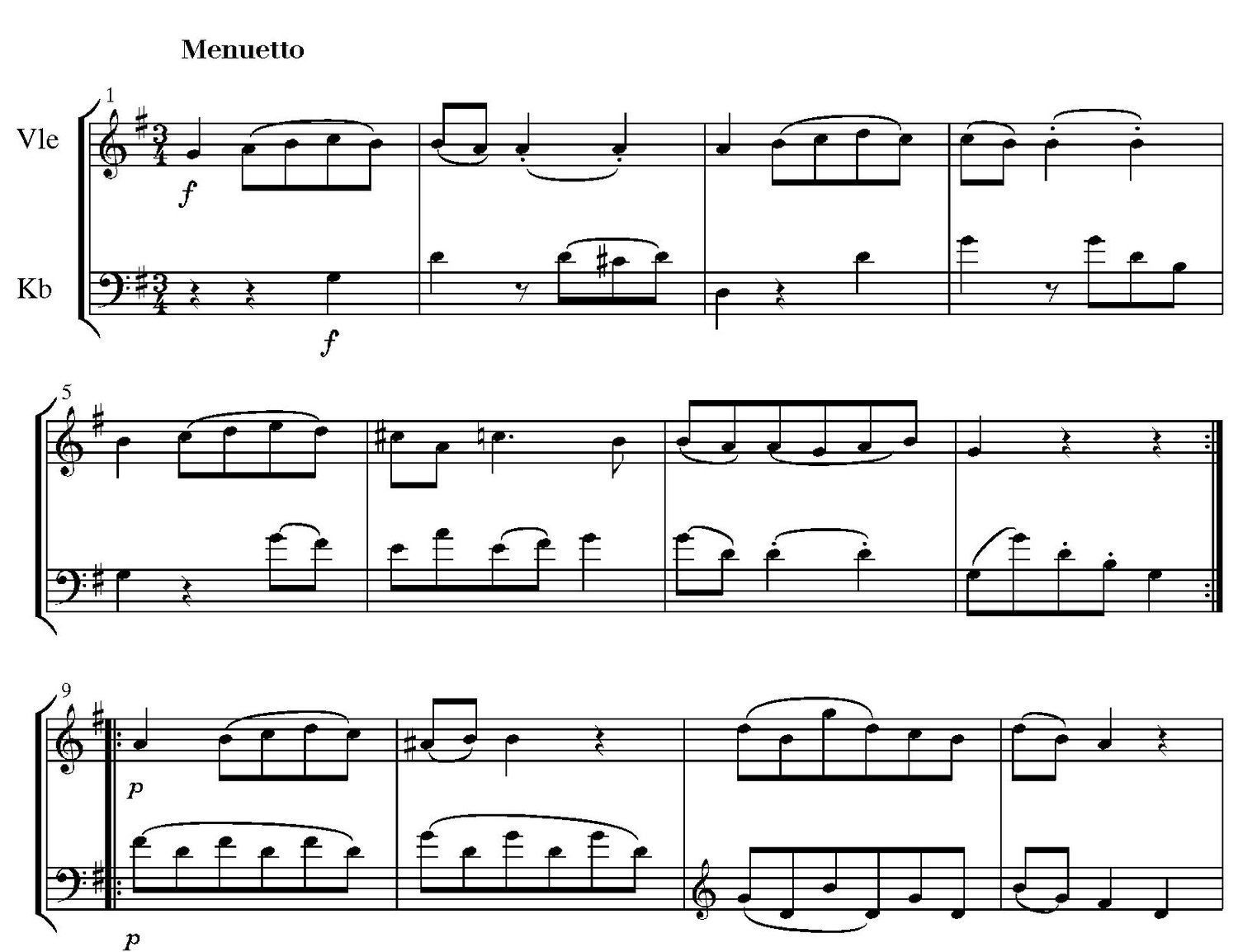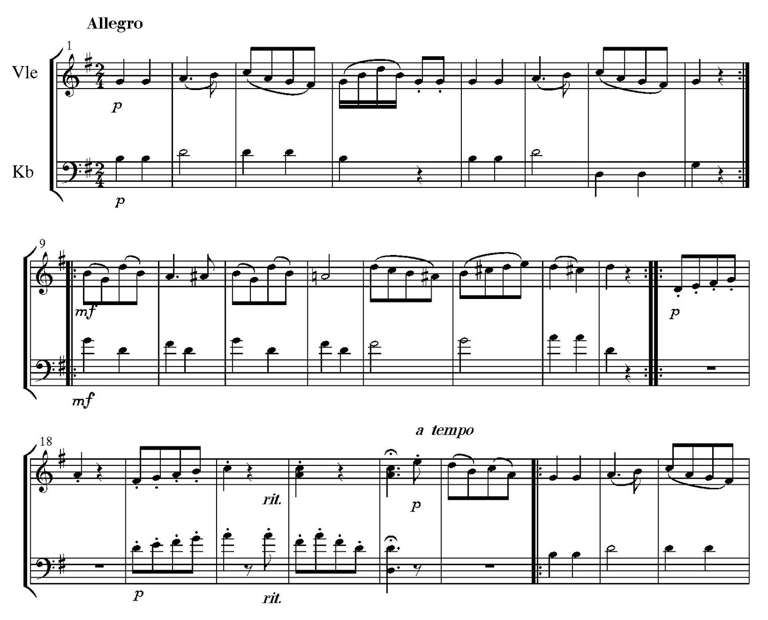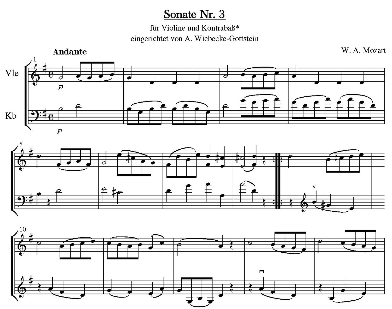 Sonaten für Violine und Kontrabass von Mozart? So ist es. Diese Sonaten bestehen aus jeweils 4 Sätzen aus den 12 „Kegelduetten“ für zwei Bassetthörner. Das ist für die Konzertpraxis ganz gut, weil 4 Sätze von Mozart als Sonate sich im Konzert besser eignen als das Publikum mit allen 12 Stücken zu ..., na ja „beglücken“. Alle 12 wären recht langatmig, obwohl es insgesamt eine angenehme Musik ist, eben Mozart. In wohldosierter Portion von 4 Sätzen sind diese Sonaten eine echte Bereicherung der Kontrabass-Literatur, die für den Bassisten dabei auch noch anspruchsvoll ist, da viele Teile der Bassstimme sich im Violinsystem aufhalten, während für den Geiger das Ganze mehr eine angenehme Übung ist.