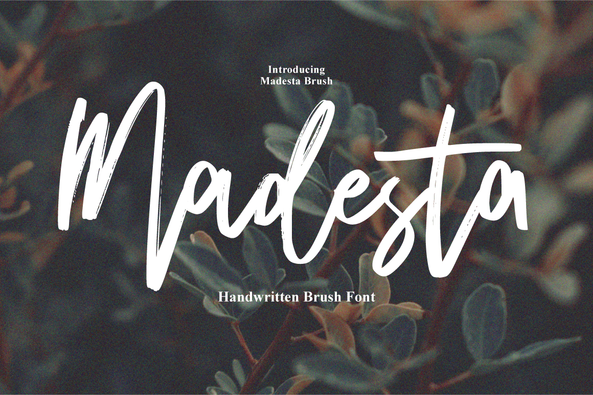 Madesta Brush is a typeface with personality. You can use it as a logo, badge, insignia, packaging, headline, poster, etc The alternative characters in this font were divided into several OpenType features such as Stylistic Alternates, Stylistic Sets, and Ligature. The OpenType features can be accessed by using OpenType program such as Adobe Illustrator, Adobe Photoshop, and Adobe InDesign.