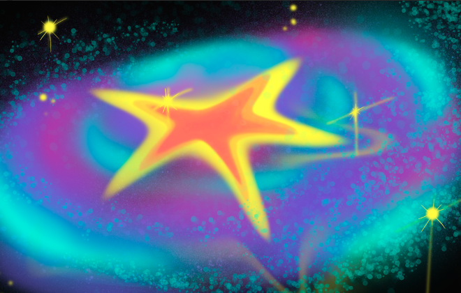 "Stardust at Play" captures the quiet joy of a star unbound by gravity, drifting freely through a field of color and light. Soft bursts of yellow and coral glow against swirling blues and violets, suggesting movement that feels curious rather than chaotic. The piece evokes a sense of childlike wonder—where stardust isn’t just matter of the cosmos, but a reminder that even in the vastness of space, there is room for play, warmth, and gentle delight.
