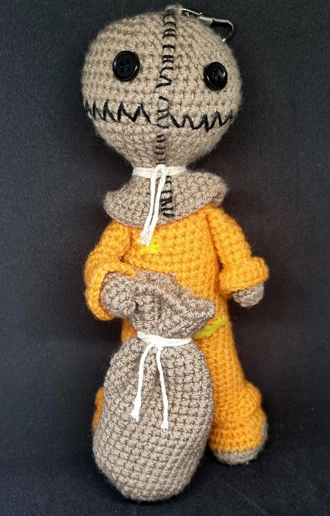 We would like to introduce to you 'Baghead Doll' he is part of 'The Teeny Weeny Collection', he is made up of basic stitches and rounds, is worked in DK (8PLY), is written in US terminology and stands at approximately 8" in height,