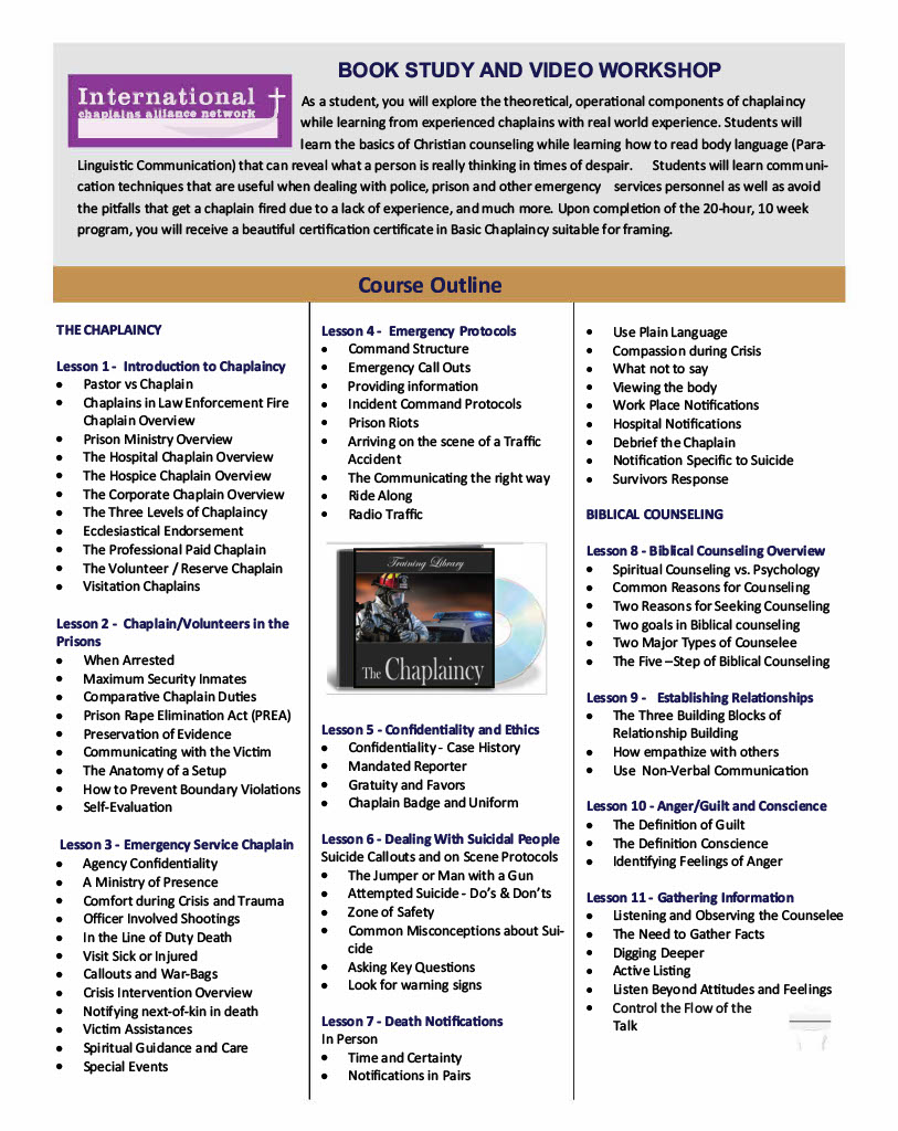 This program is helpful for people who have no formal training in chaplaincy but conduct or want to conduct prison, hospital, hospice and Nursing home care visits or provide community support in a religious setting. The Basic Chaplain Training Program is beneficial for ministers who want to incorporate volunteer chaplaincy work into their religious outreach program or the experienced chaplain who wants to continue with refresher training. The course includes a training manual (PDF) packed with information and counseling resources and tools that can be used over the coming years. of chaplaincy. Upon completion of the 20-hour study program, you will receive a beautiful college style certificate of certification issued by college board of examiners suitable for framing and you become eligible for licensing or/and ordination through International Chaplains Alliance Network.