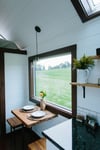 Above, a versatile loft offers additional sleeping space or storage. Accessible via integrated ladders and featuring a large skylight window, the loft is bathed in natural daylight and provides a means of egress. At the opposite end of the home, a clever storage area above the bathroom can house plumbing equipment or other items, ensuring every inch of space is utilized efficiently.