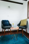 The functional kitchen is a chef's delight, equipped with a large Belfast ceramic sink, a 10 Cu Ft fridge-freezer, a 2-burner induction hob, and a countertop smart oven. Extensive storage options, including numerous wall and floor cabinets, provide space for all your kitchen essentials. The kitchen also boasts a combo washer/dryer, adding convenience to your daily routine.